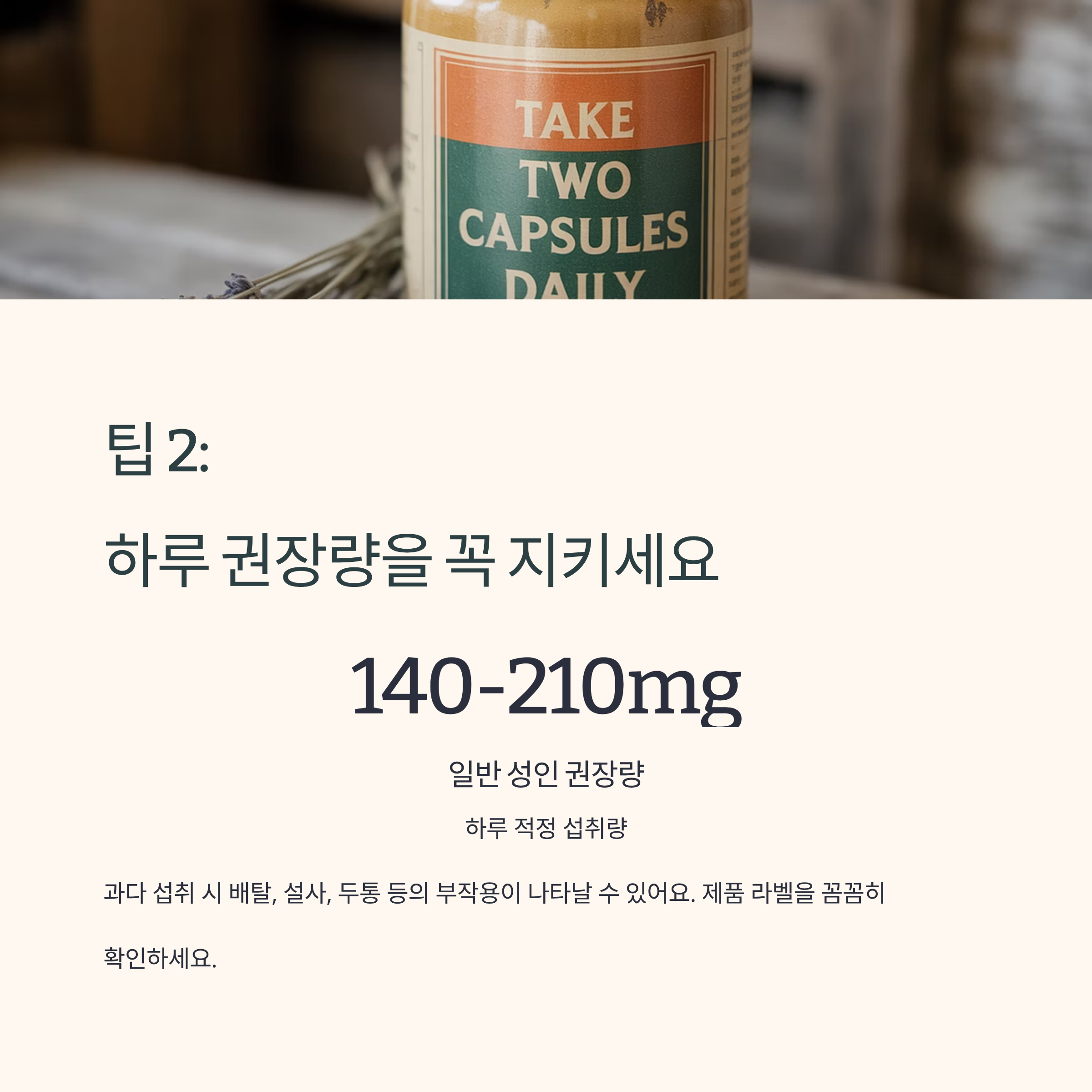 ✔ 권장량(140~210mg/day)을 반드시 지켜야 합니다.