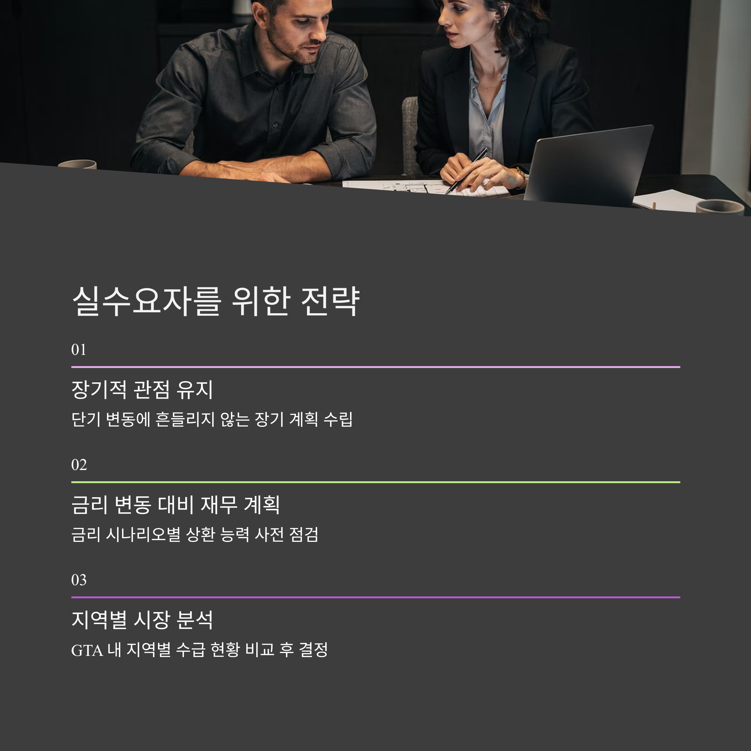시장 불확실성이 존재하는 상황에서 실수요자는 장기적인 관점에서 접근하는 것이 중요합니다. 금리 변동을 고려한 재무 계획과 지역별 시장 분석을 통해 안정적인 주택 구매 전략을 수립하는 것이 바람직합니다.