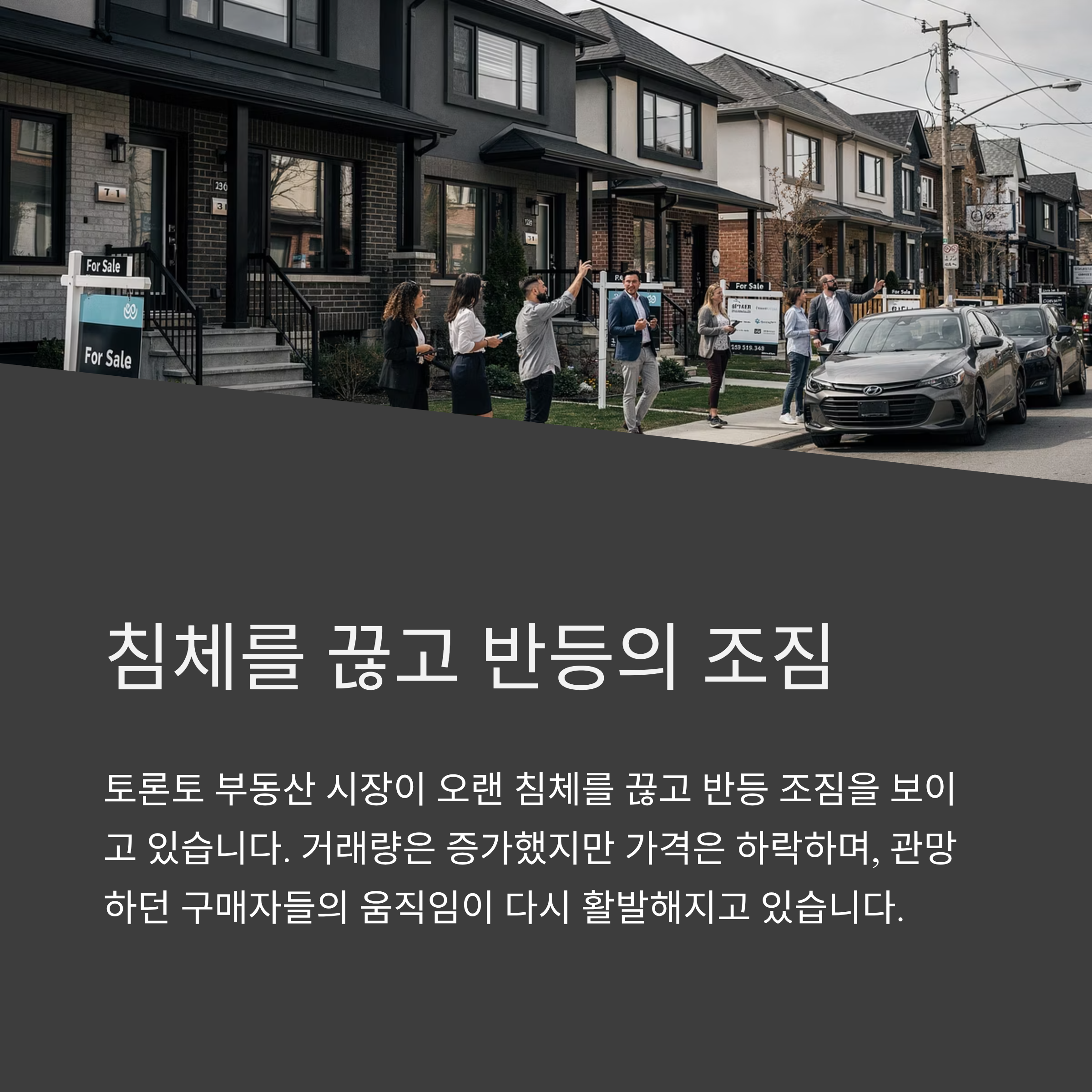 토론토 부동산 시장이 오랜 침체 흐름을 끊고 반등의 조짐을 보이고 있습니다. 거래량은 증가했지만 평균 주택 가격은 하락하면서, 그동안 관망하던 구매자들의 움직임이 다시 활발해지고 있습니다. 이번 변화는 향후 캐나다 부동산 시장의 방향성을 가늠할 중요한 신호로 평가됩니다.