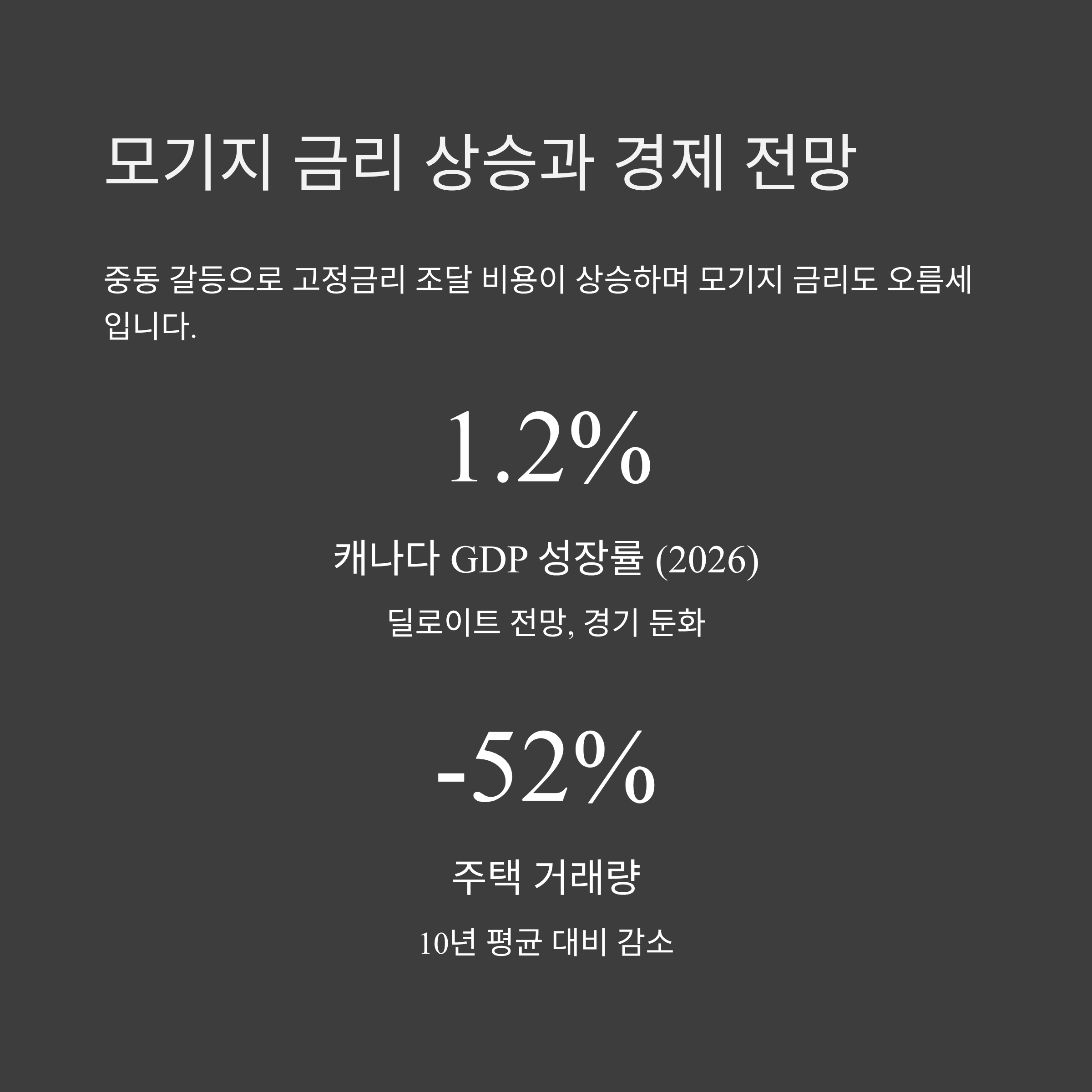 중동 지역의 갈등으로 인해 고정금리 대출의 자금 조달 비용이 상승하면서 모기지 금리 역시 오름세를 보이고 있습니다. 글로벌 회계법인 딜로이트는 캐나다의 경제 성장률이 2026년 1.2%로 둔화될 것으로 전망하며, 이는 부동산 시장에도 영향을 미칠 것으로 예상됩니다.