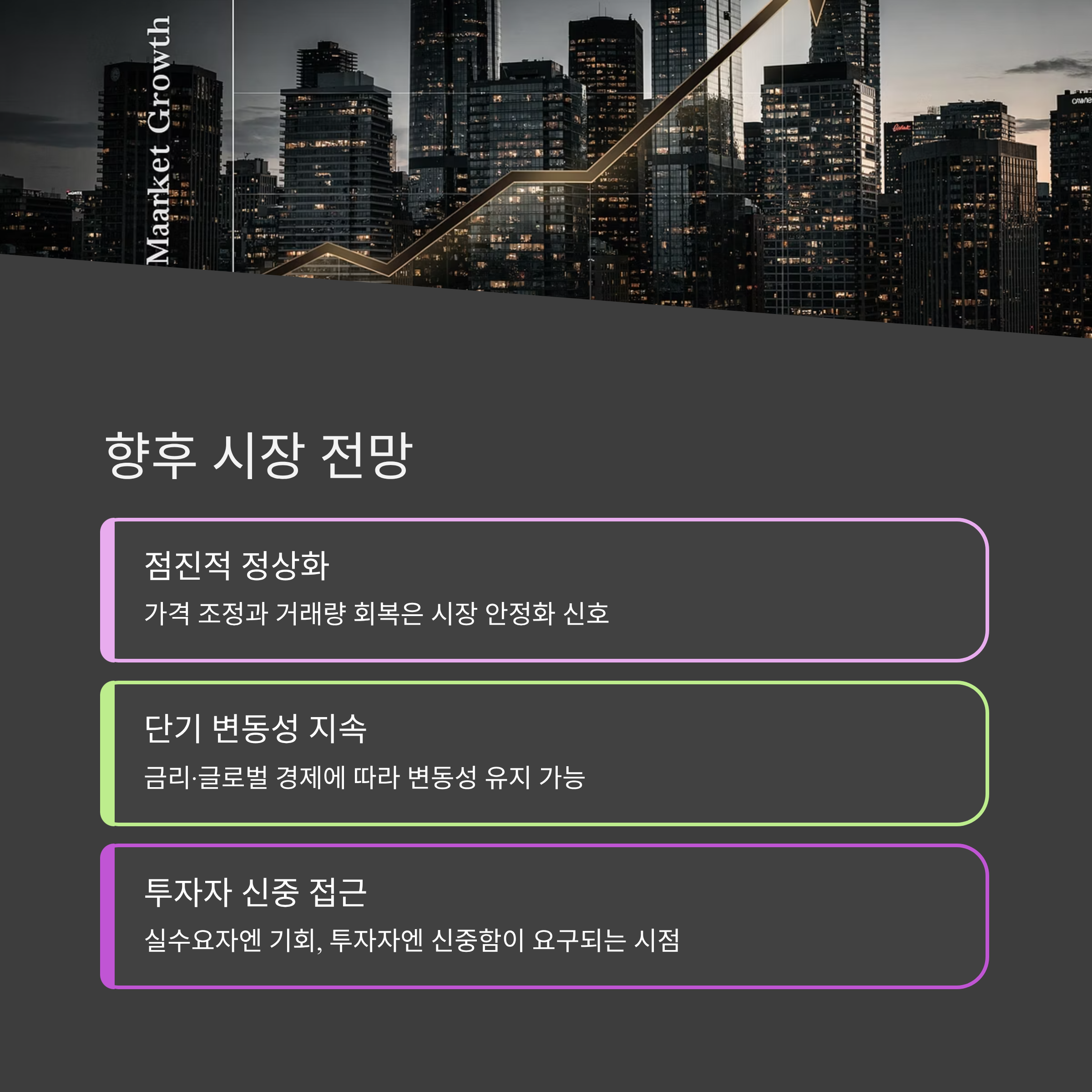 현재의 가격 조정과 거래량 회복은 시장의 점진적인 정상화를 의미합니다. 다만 금리와 글로벌 경제 상황에 따라 단기적인 변동성은 지속될 가능성이 높습니다. 실수요자에게는 기회가 될 수 있으며, 투자자에게는 신중한 접근이 요구되는 시점입니다.