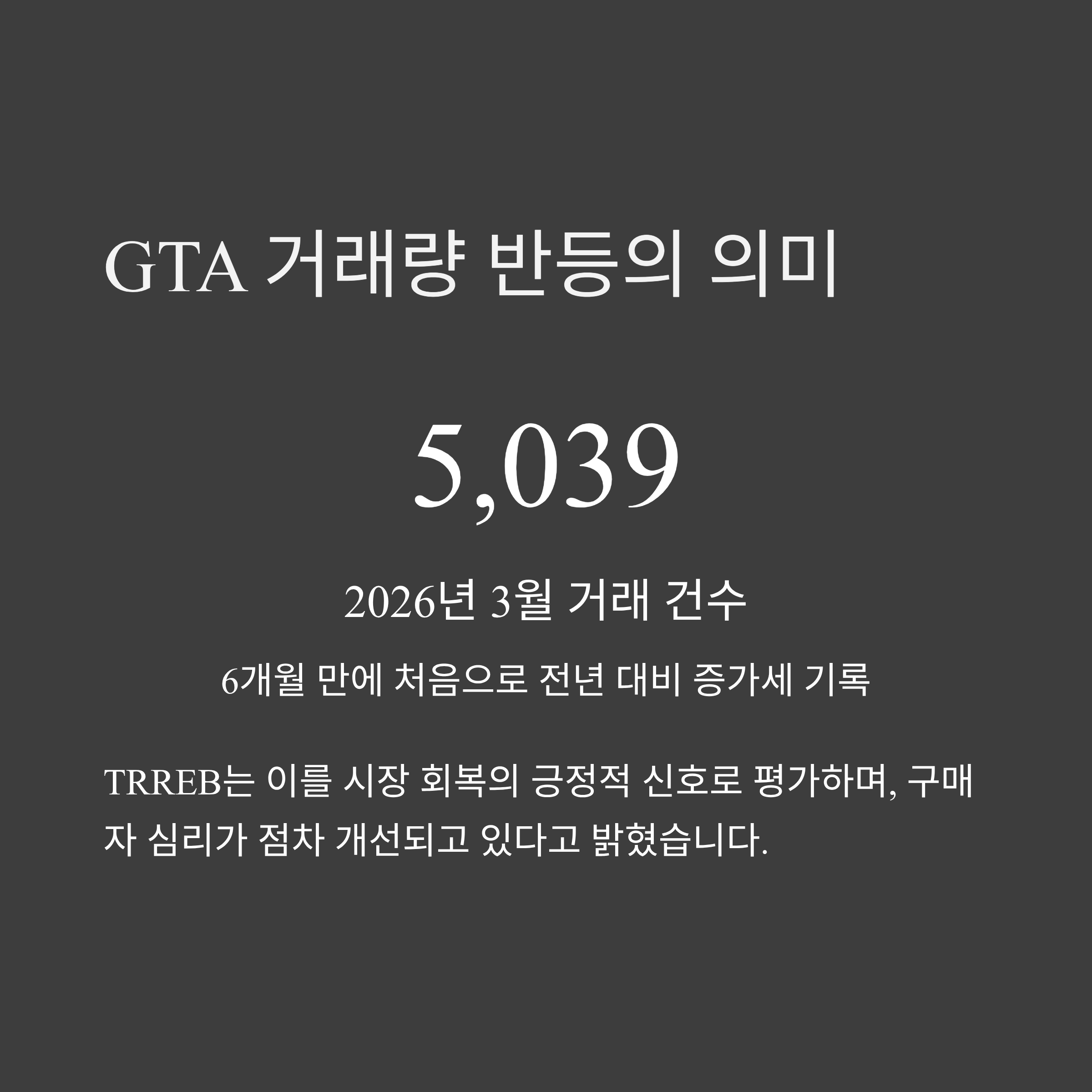 2026년 3월, 광역 토론토 지역에서는 총 5,039건의 주택이 거래되며 6개월 만에 처음으로 전년 대비 증가세를 기록했습니다. 토론토지역부동산위원회(TRREB)는 이러한 흐름을 시장 회복의 긍정적인 신호로 평가하며, 구매자 심리가 점차 개선되고 있다고 밝혔습니다.
