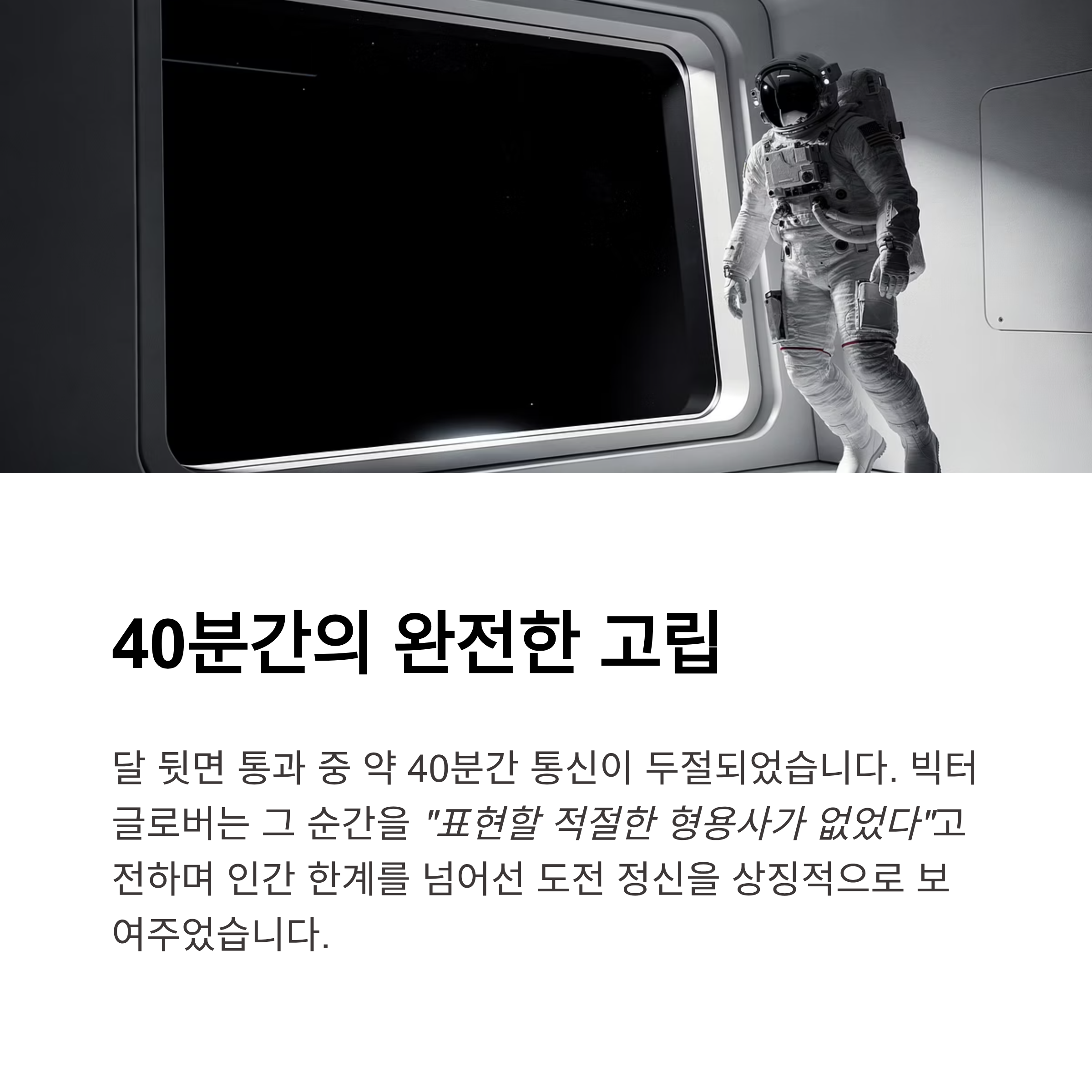 달의 뒷면을 통과하는 동안 약 40분간의 계획된 통신 두절이 발생했습니다. 이 시간 동안 승무원들은 완전히 고립된 상태에서 우주의 장엄함을 체험했으며, 빅터 글로버는 그 순간을 표현할 적절한 형용사가 없었다고 전했습니다. 이러한 경험은 인간의 한계를 넘어선 도전 정신을 상징적으로 보여줍니다.