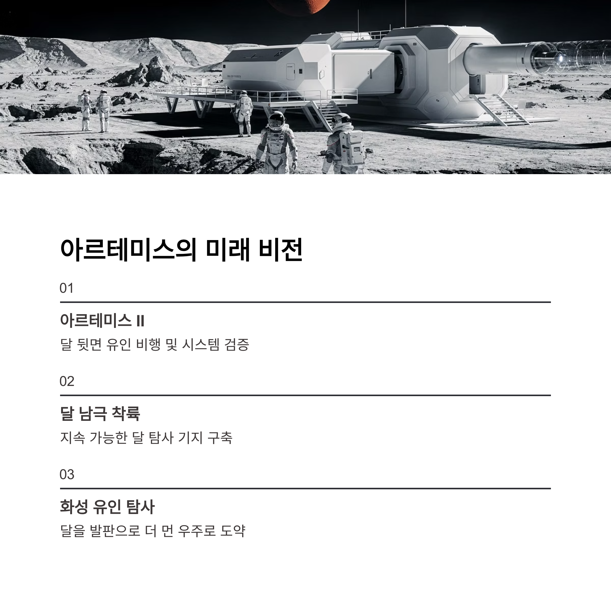 아르테미스 II 임무는 향후 달 남극 착륙을 목표로 하는 아르테미스 프로그램의 핵심 단계입니다. 이 프로그램은 지속 가능한 달 탐사와 더불어 화성 유인 탐사의 발판을 마련하는 것을 목표로 하고 있습니다. 인류는 다시 한번 달을 넘어 더 먼 우주로 나아갈 준비를 하고 있습니다.