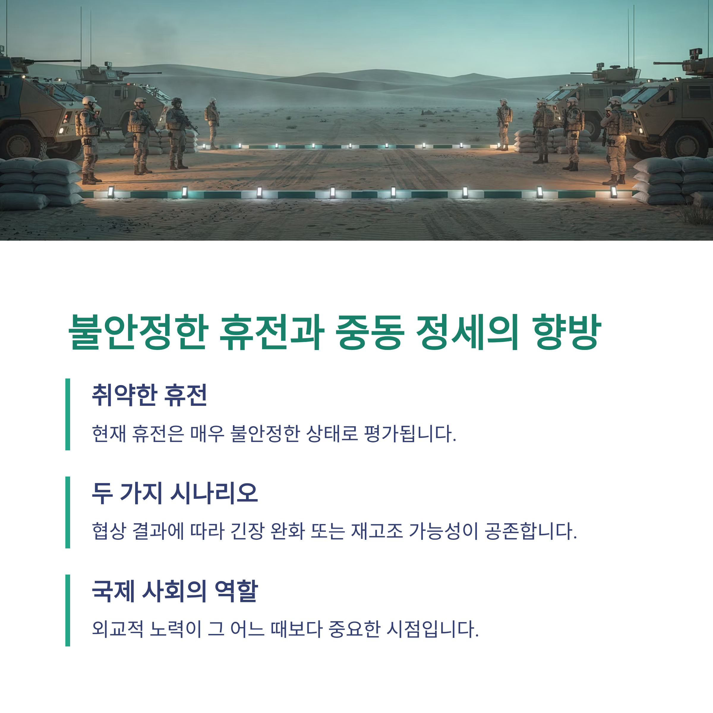 현재 유지되고 있는 휴전은 매우 취약한 상태로 평가됩니다. 협상 결과에 따라 중동 지역의 긴장이 완화될 수도, 다시 고조될 수도 있는 만큼 국제 사회의 외교적 노력이 중요한 시점입니다.