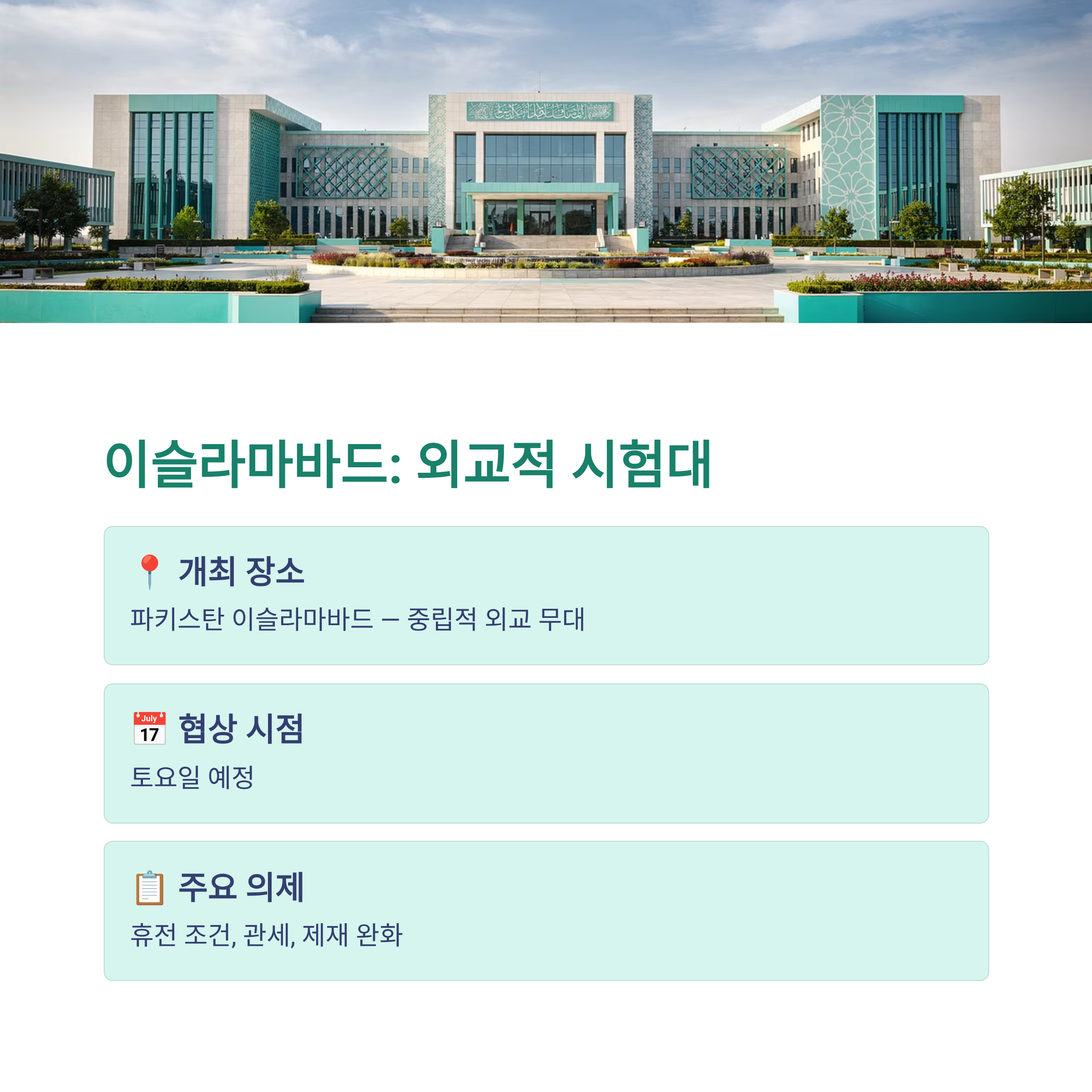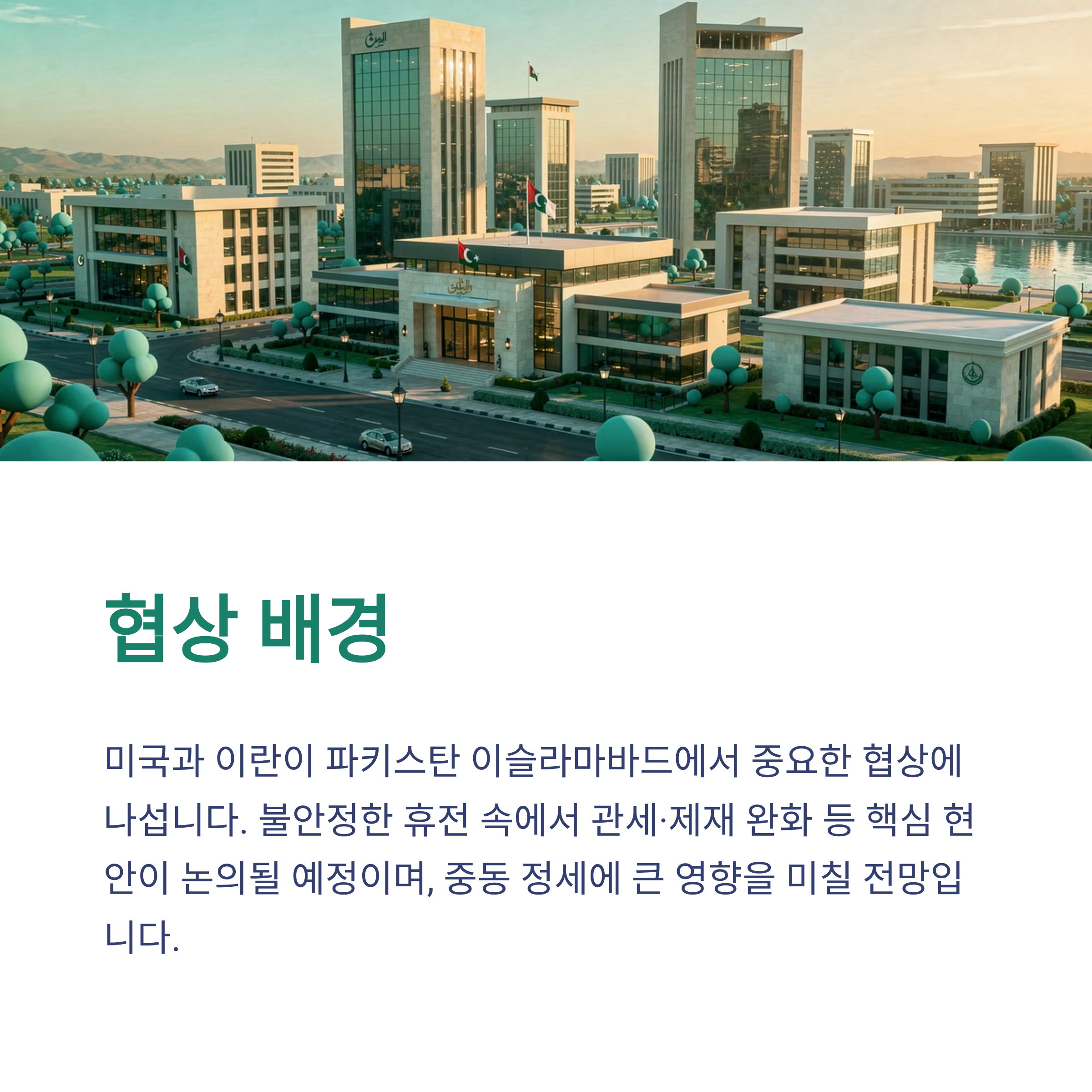 협상 장소로 선택된 파키스탄 이슬라마바드는 중립적인 외교 무대로 평가받고 있습니다. 이번 회담은 휴전 유지 여부를 결정짓는 중요한 분수령이 될 전망이며, 국제 사회 역시 그 결과를 주의 깊게 지켜보고 있습니다.