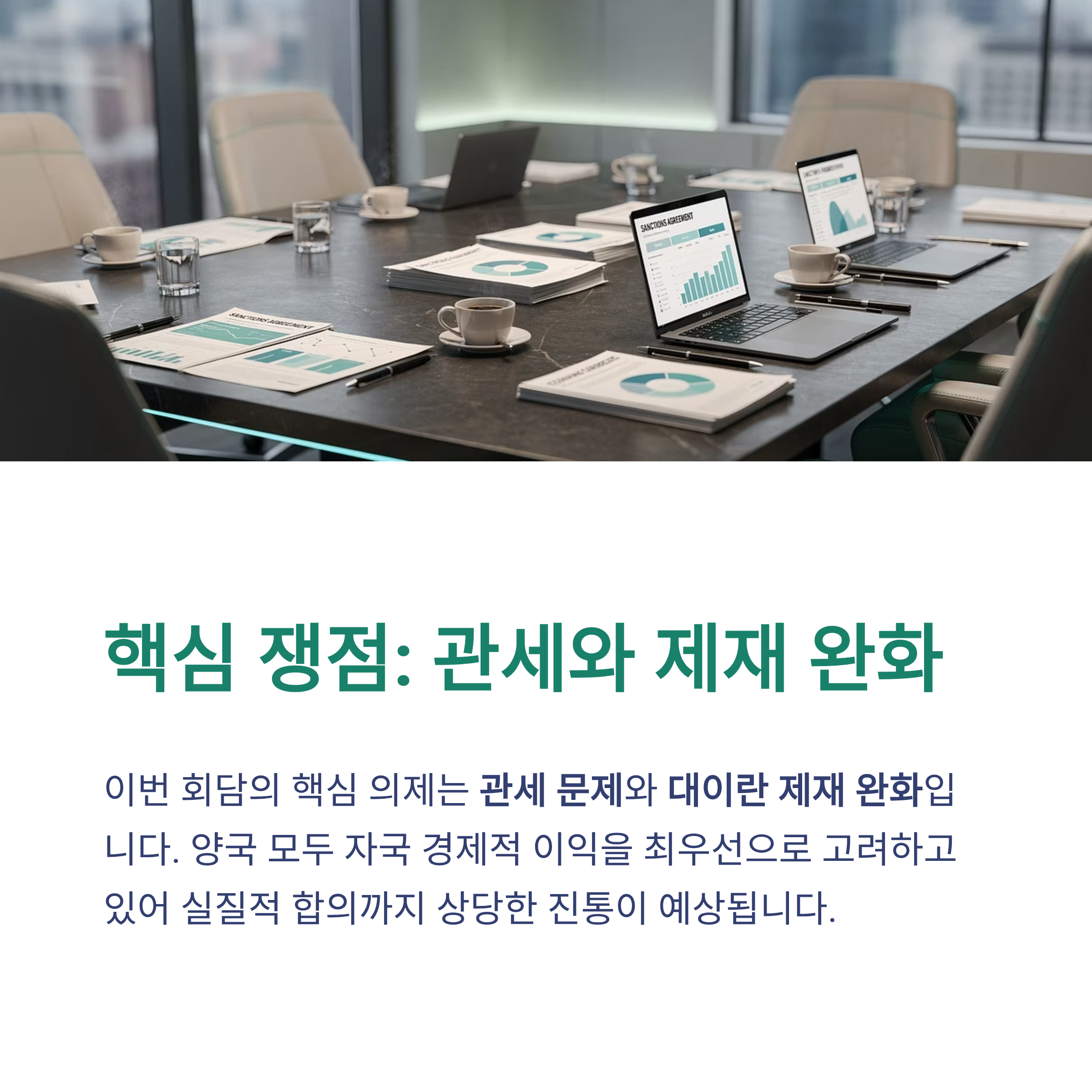 이번 회담의 핵심 의제는 경제적 이해관계와 직결된 관세 문제와 대이란 제재 완화입니다. 양국 모두 자국의 경제적 이익을 최우선으로 고려하고 있어, 실질적인 합의 도출까지는 상당한 진통이 예상됩니다.