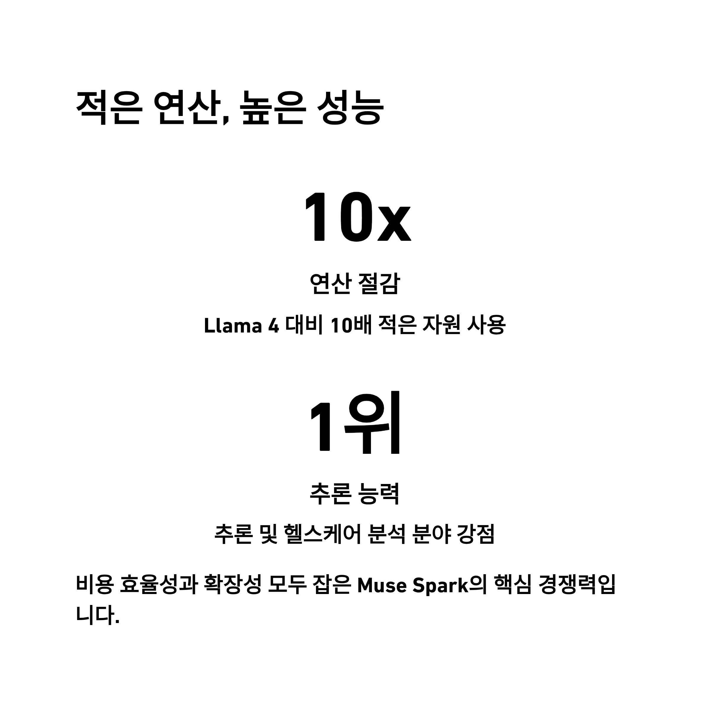 Meta의 기술 블로그에 따르면 Muse Spark는 중형 모델인 Llama 4 대비 10배 적은 연산 자원을 사용하면서도 경쟁력 있는 성능을 제공합니다. 이는 비용 효율성과 확장성 측면에서 큰 장점으로 작용하며, 특히 추론 능력과 헬스케어 분석 분야에서 강점을 보일 것으로 기대됩니다.