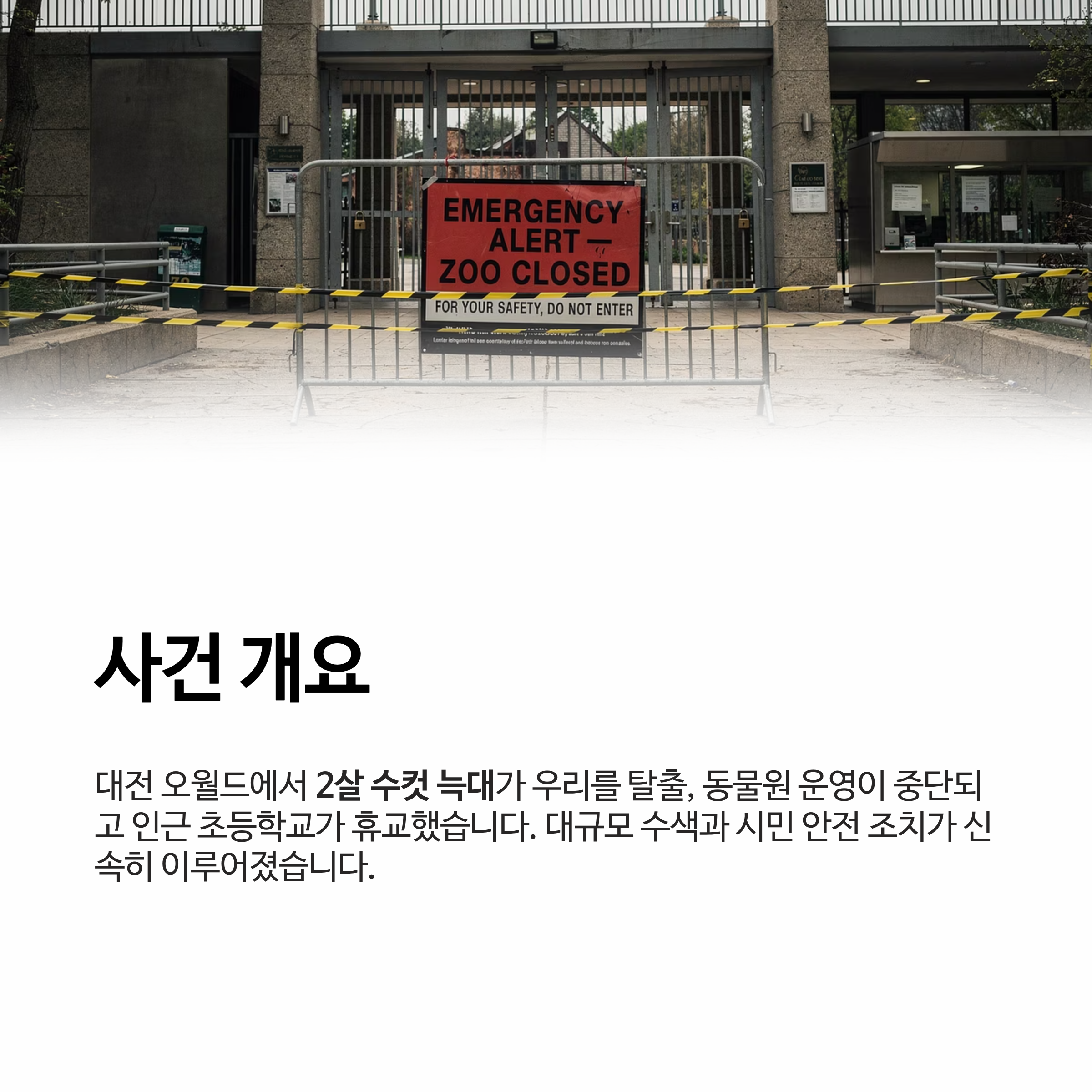 | 초기 조치 | 동물원 운영 중단 및 수색 개시 |