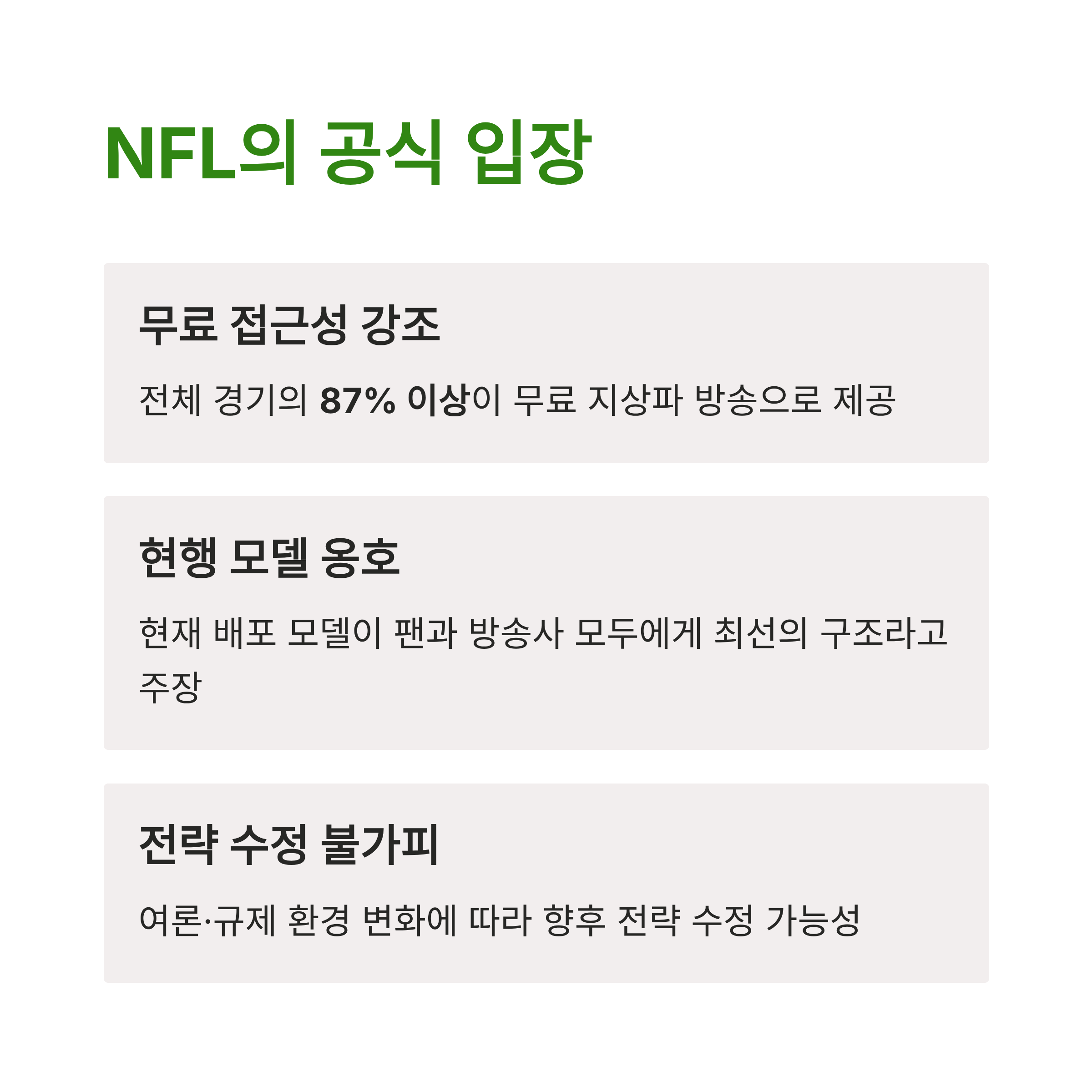 NFL 측은 전체 경기의 87% 이상이 무료 지상파 방송을 통해 제공되고 있으며, 현재의 배포 모델이 팬과 방송사 모두에게 가장 우호적인 구조라고 주장하고 있습니다. 그러나 여론과 규제 환경 변화에 따라 향후 전략 수정이 불가피할 것으로 보입니다.