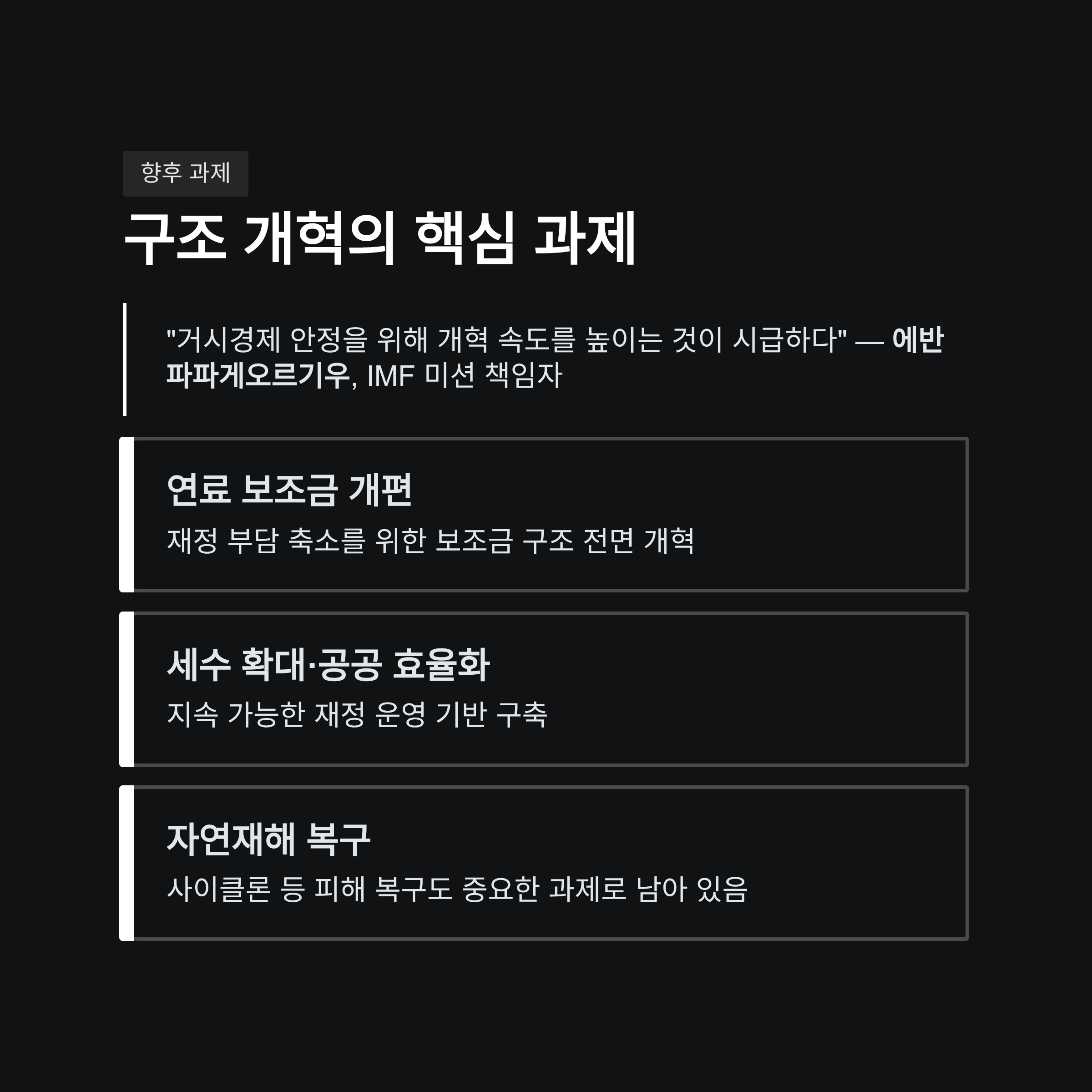 IMF 미션 책임자인 에반 파파게오르기우는 거시경제 안정을 위해 개혁 속도를 높이는 것이 시급하다고 강조했습니다. 연료 보조금 개편, 세수 확대, 공공 부문 효율화 등은 향후 스리랑카 경제의 지속 가능성을 좌우할 핵심 과제로 꼽힙니다. 또한 사이클론 등 자연재해로 인한 피해 복구 역시 중요한 과제로 남아 있습니다.