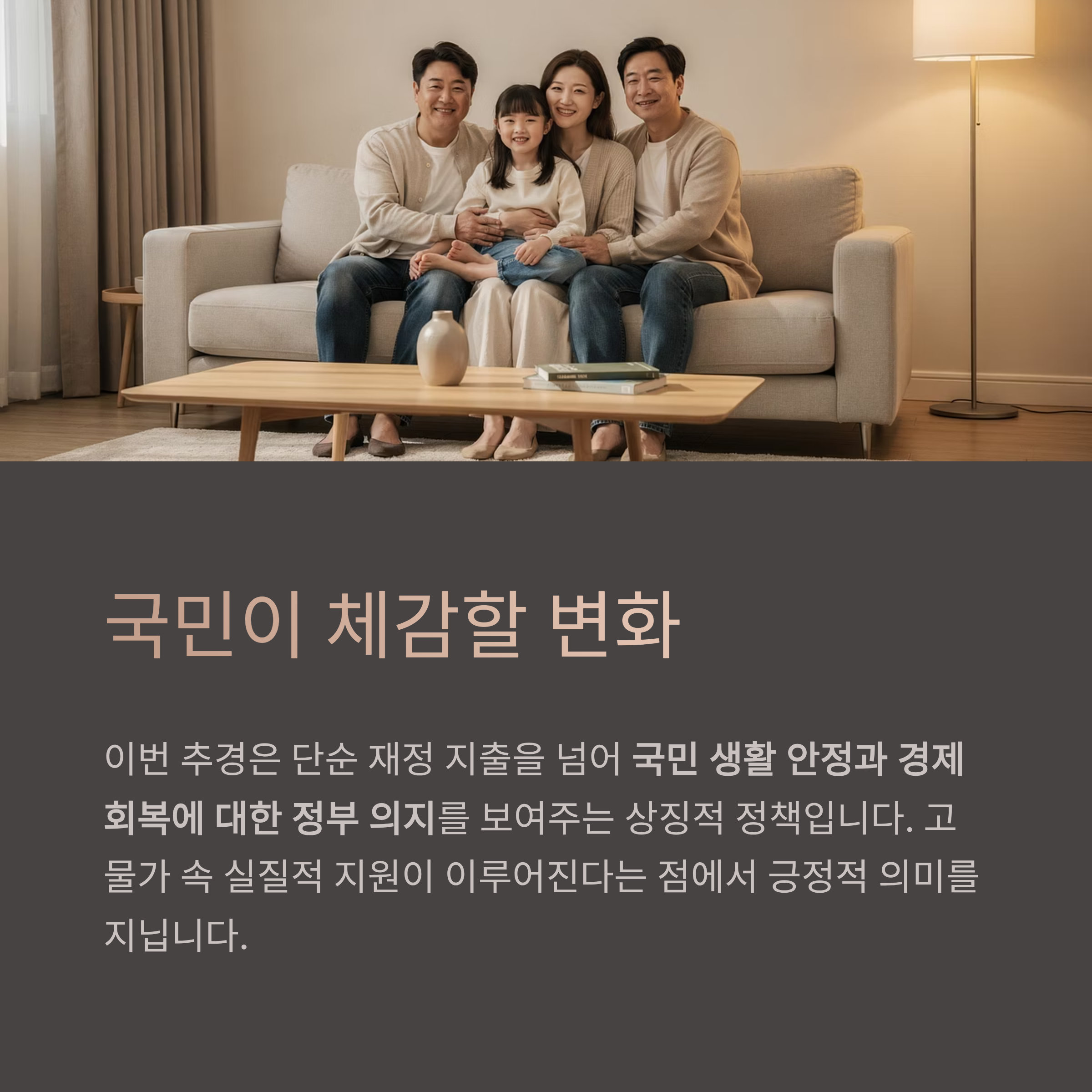 이번 조치는 단순한 재정 지출을 넘어 국민 생활 안정과 경제 회복에 대한 정부의 의지를 보여주는 상징적인 정책입니다. 고물가와 경기 불확실성 속에서 국민이 체감할 수 있는 실질적인 지원이 이루어진다는 점에서 긍정적인 의미를 지니고 있습니다. 앞으로의 정책 집행 과정과 그 효과에 많은 관심이 집중되고 있습니다.
