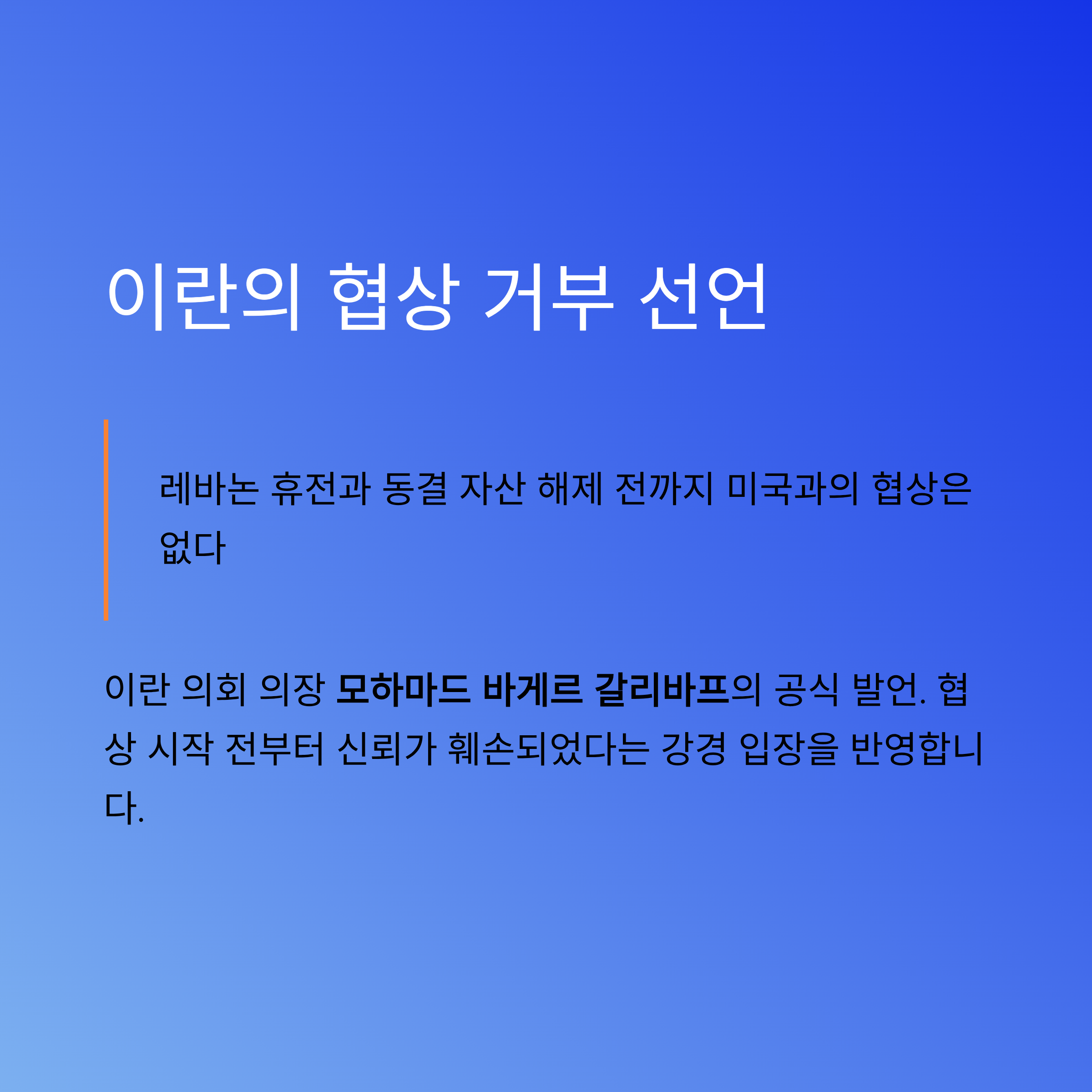 이란 의회 의장인 모하마드 바게르 갈리바프는 레바논에서의 휴전이 이루어지고 이란의 동결 자산이 해제되기 전까지 미국과의 협상은 없을 것이라고 밝혔습니다. 이는 외교 협상의 기본 조건이 충족되지 않았다는 강경한 입장을 반영하며, 협상 시작 전부터 신뢰가 훼손되었다는 점을 강조한 것입니다.