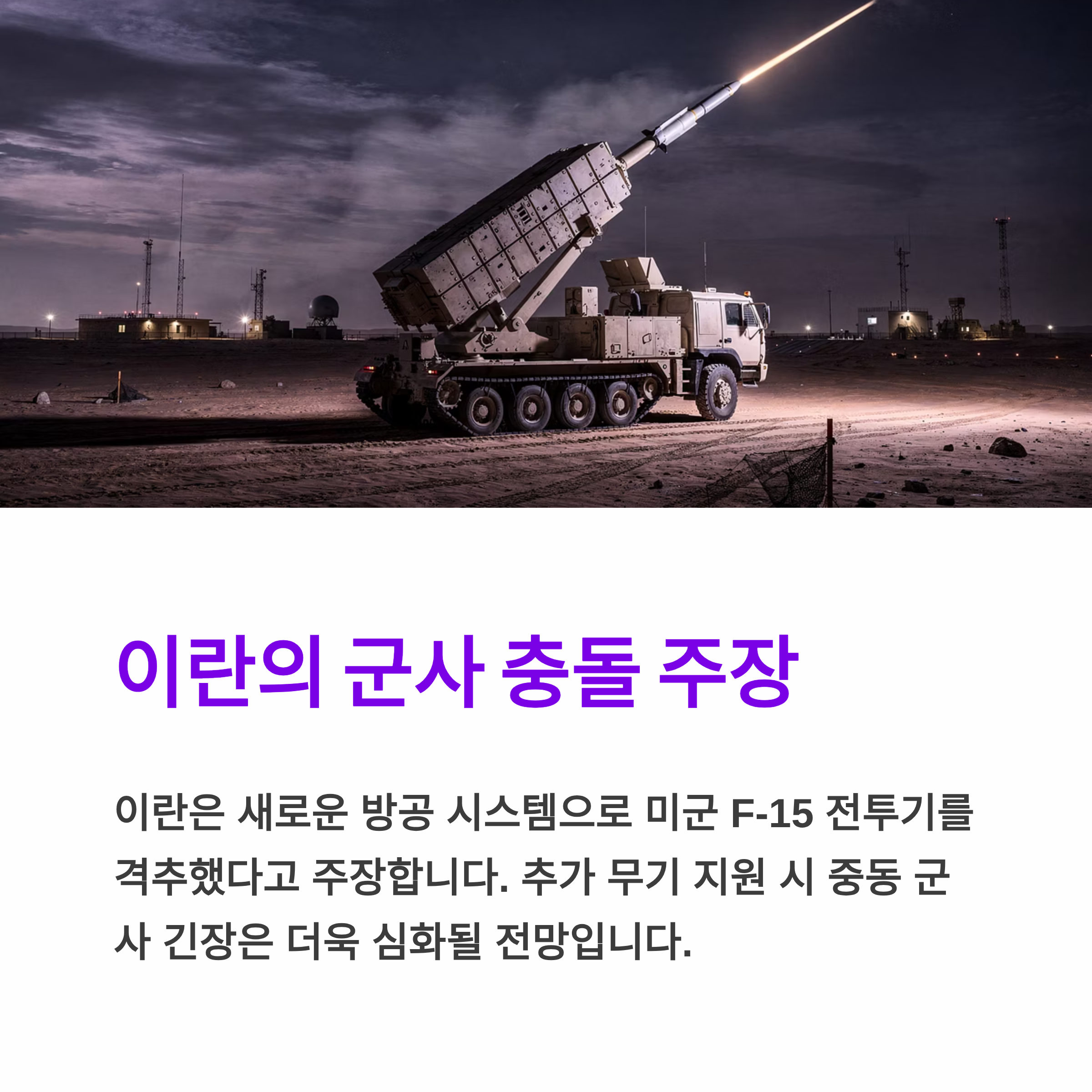 보도에 따르면 이란은 최근 새로운 방공 시스템을 활용해 미군 F-15 전투기를 격추했다고 주장하고 있습니다. 만약 추가적인 무기 지원이 이루어진다면, 중동 지역에서의 군사적 긴장은 더욱 심화될 가능성이 큽니다.