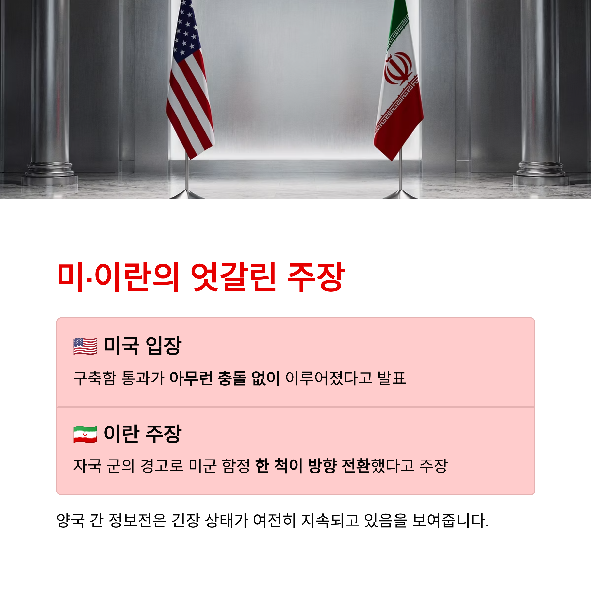 미국 측은 구축함 통과가 아무런 충돌 없이 이루어졌다고 밝혔지만, 이란 국영 매체는 자국 군이 경고를 보내 미군 함정 중 한 척이 방향을 전환했다고 주장하며 상반된 입장을 보였습니다. 이러한 정보전은 양국 간 긴장 상태가 여전히 지속되고 있음을 보여줍니다.