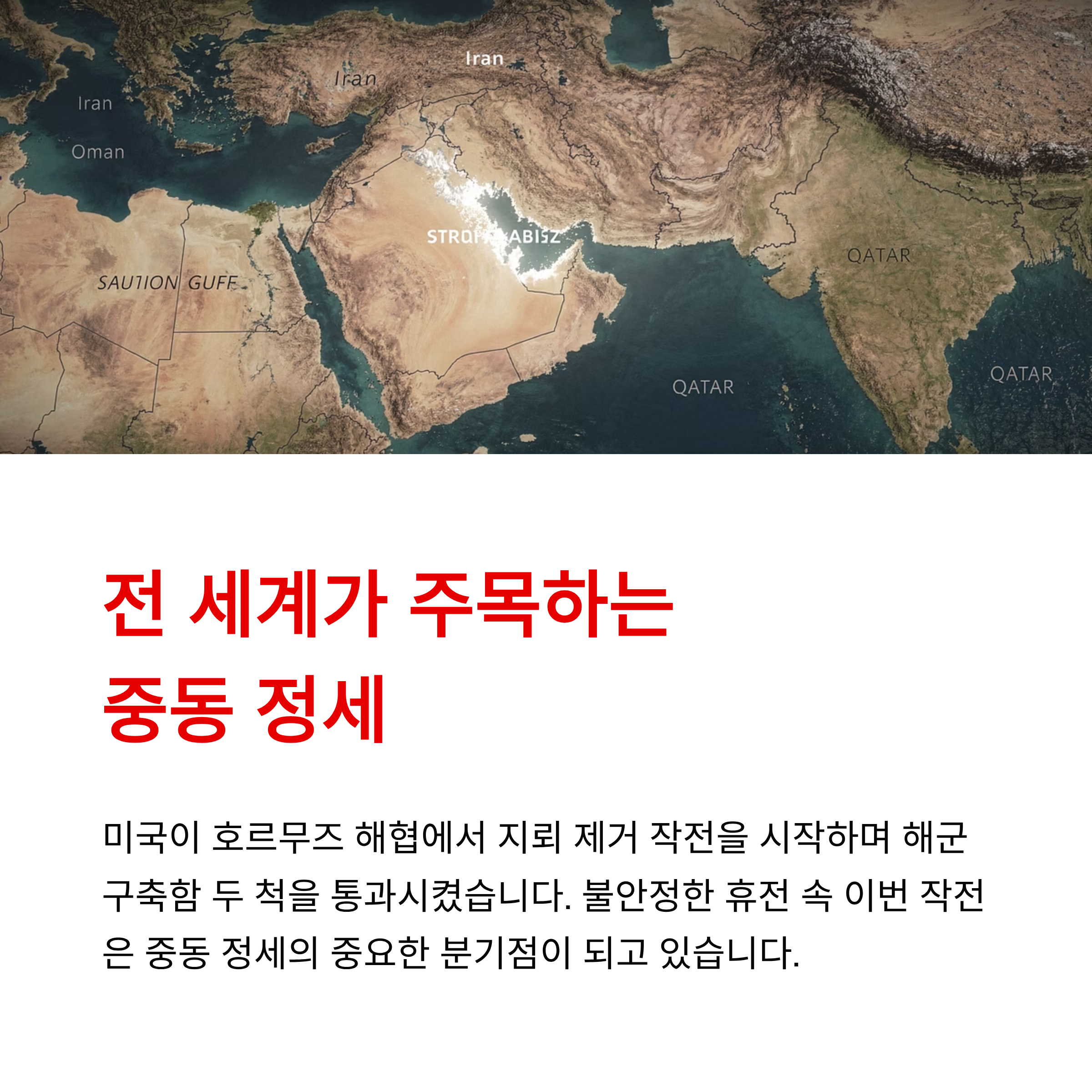 최근 중동 정세가 다시 한 번 전 세계의 이목을 집중시키고 있습니다. 미국이 호르무즈 해협에서 지뢰 제거 작전을 시작하며 해군 구축함 두 척을 통과시켰다는 소식은 국제 안보와 에너지 시장에 큰 파장을 일으키고 있습니다. 불안정한 휴전 상황 속에서 진행된 이번 작전은 향후 중동 정세의 방향을 가늠할 중요한 분기점이 되고 있습니다.