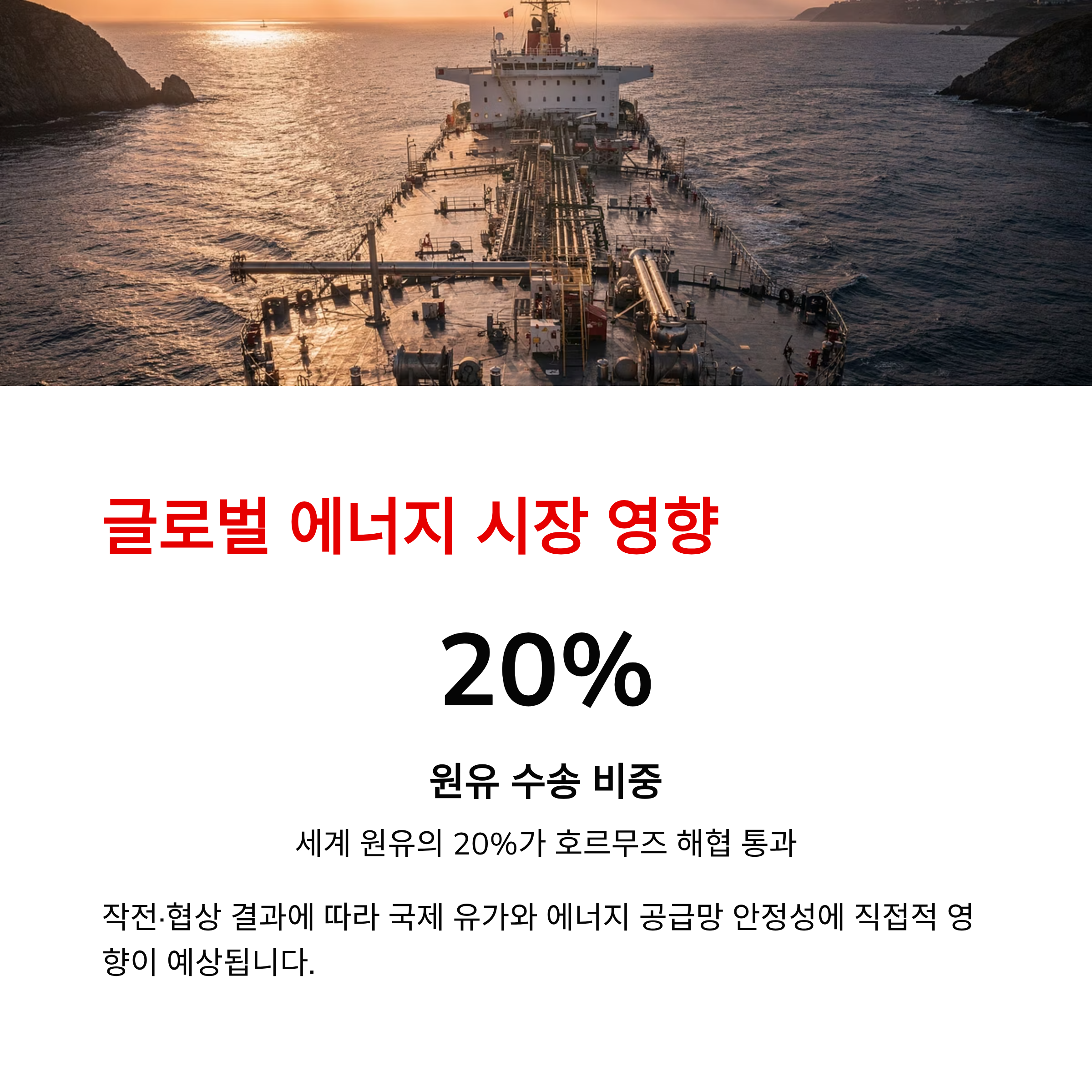 호르무즈 해협은 세계 원유 수송의 약 20%가 통과하는 핵심 해상 요충지입니다. 이번 작전과 협상 결과에 따라 국제 유가와 에너지 공급망 안정성에 직접적인 영향을 미칠 것으로 예상되며, 각국의 경제에도 중요한 변수로 작용하고 있습니다.