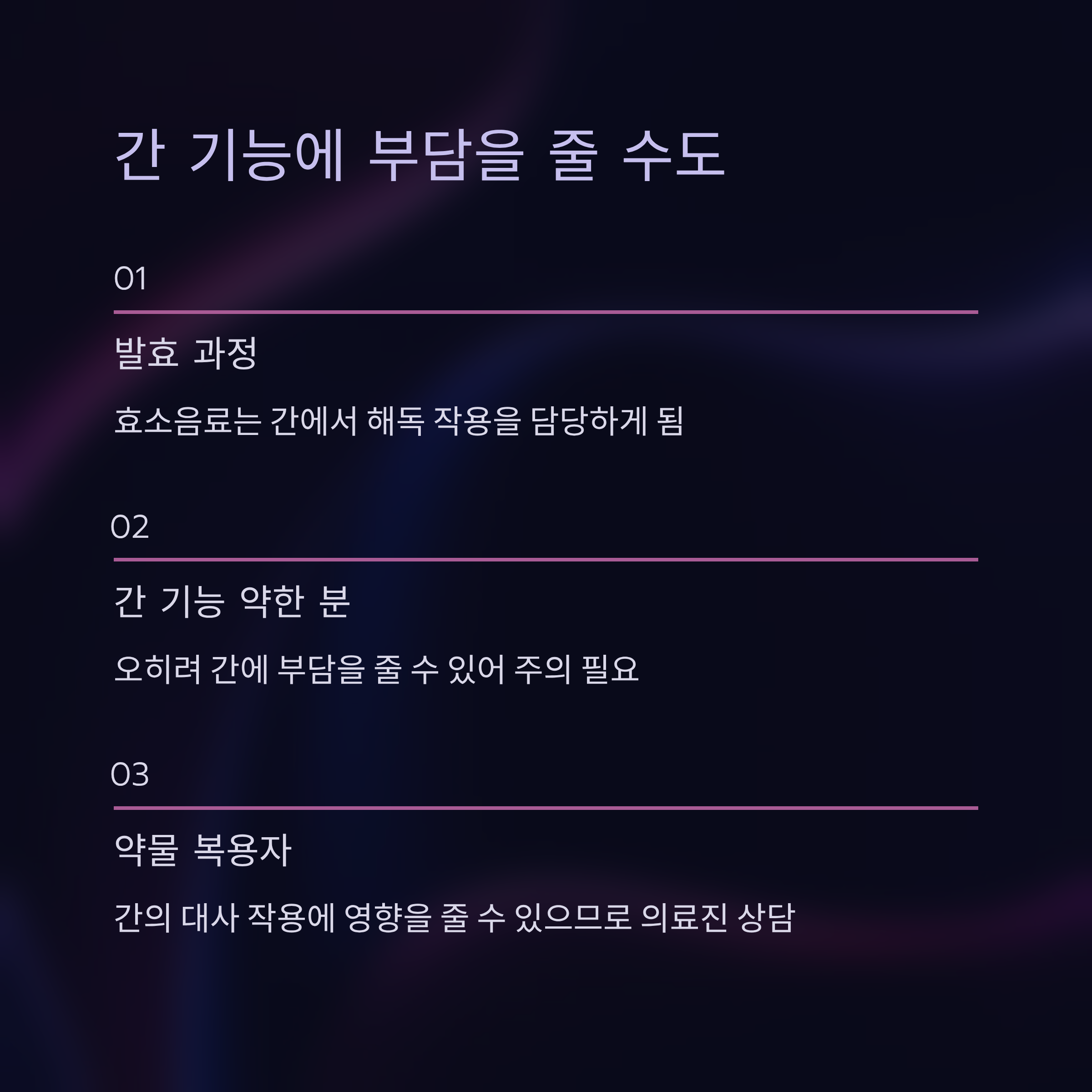 평소 간이 약하거나 약물·영양제를 복용 중인 분은 간 대사 부담이 커질 수 있으므로 주의하세요.
