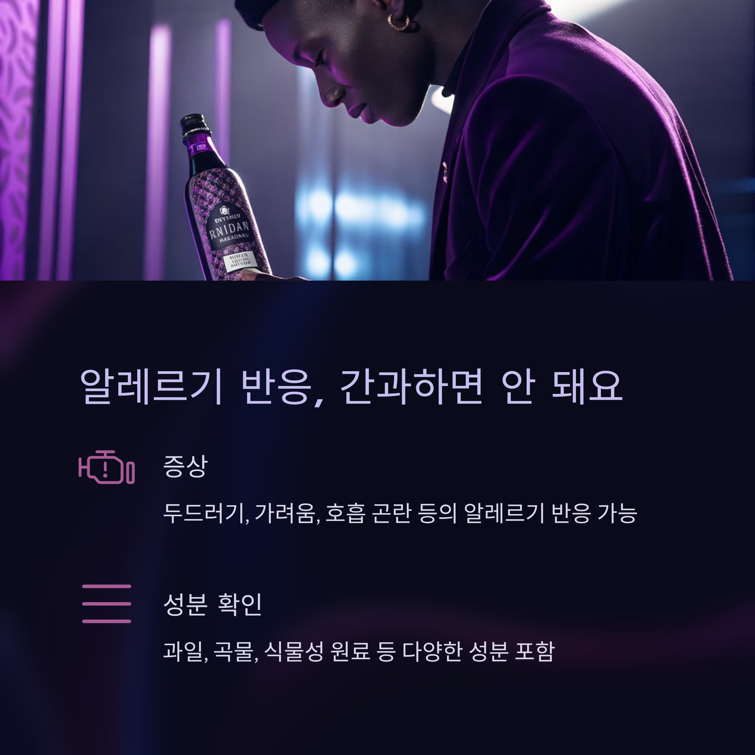 효소음료에 포함된 과일, 곡물, 식물성 원료 성분은 알레르기를 일으킬 수 있습니다. 두드러기, 가려움, 호흡 곤란 시 즉시 중단해야 합니다.