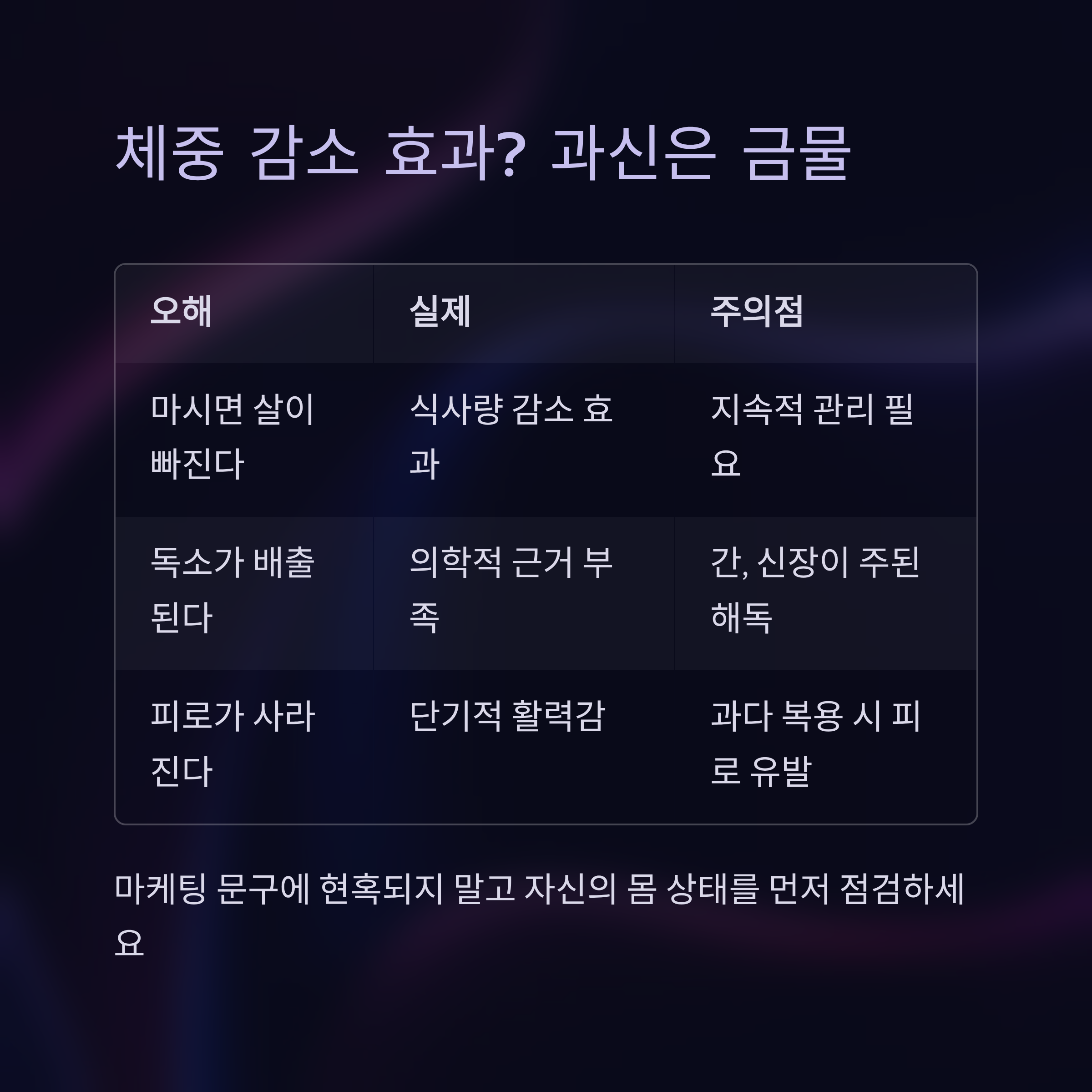 | 마시면 살이 빠진다 | 식사량 감소 착각 | 지속 관리 필요 |