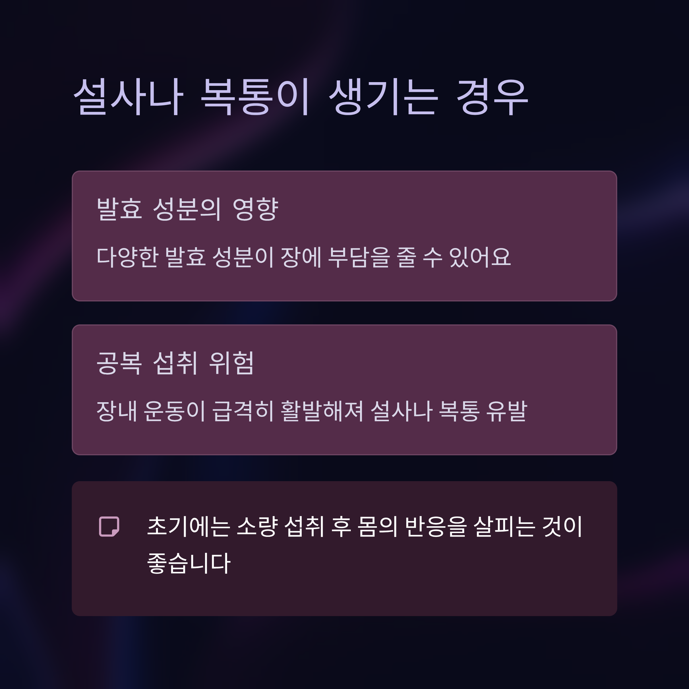 특히 과민성 대장증후군이나 위염 환자라면 주의가 필요합니다. 위산과 섞여 과도하게 작용할 경우 속쓰림, 가스가 찰 수 있어요.