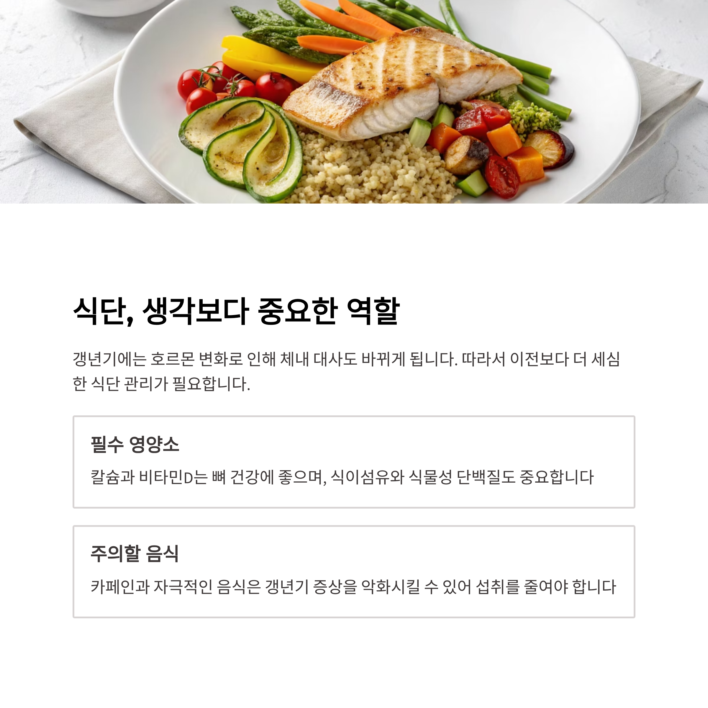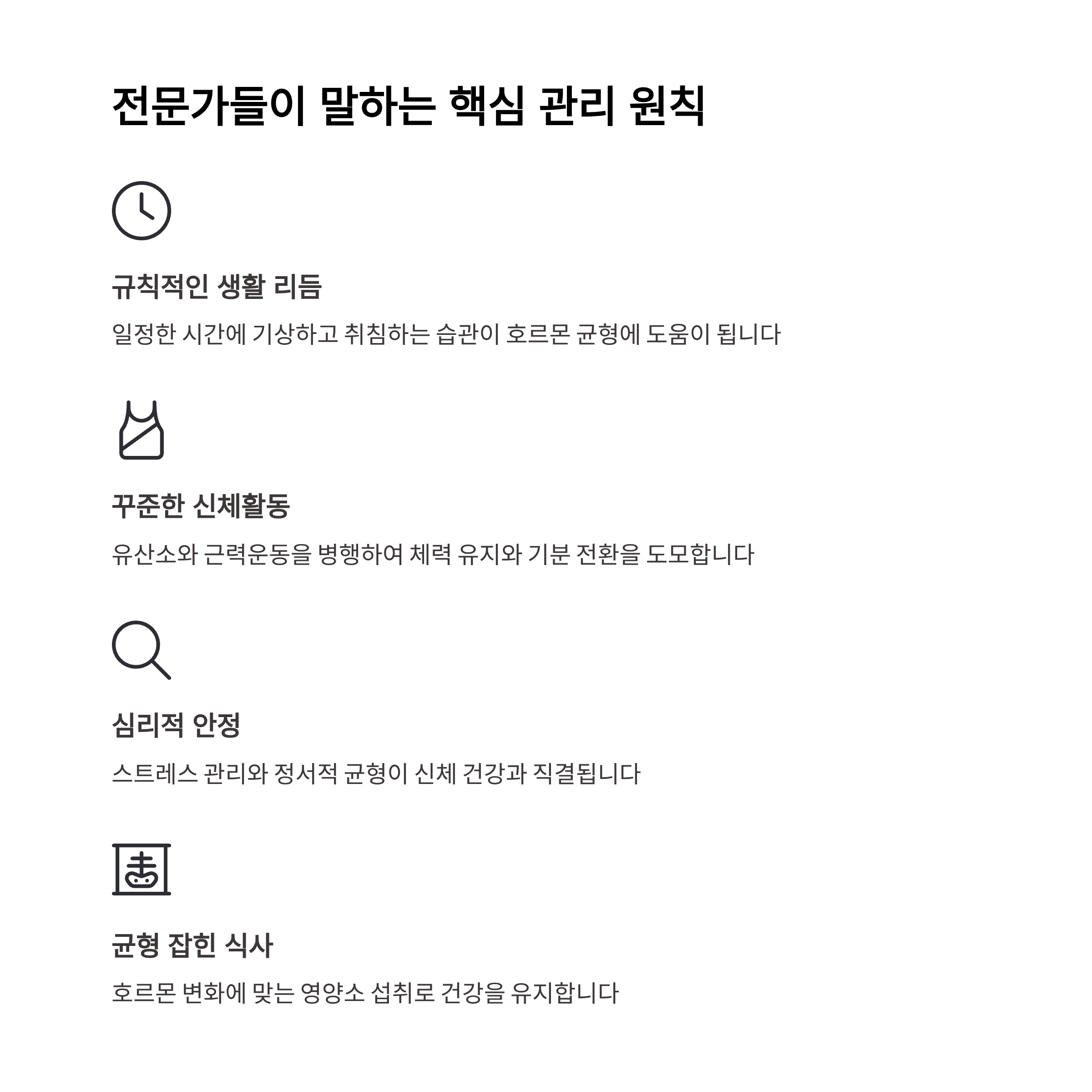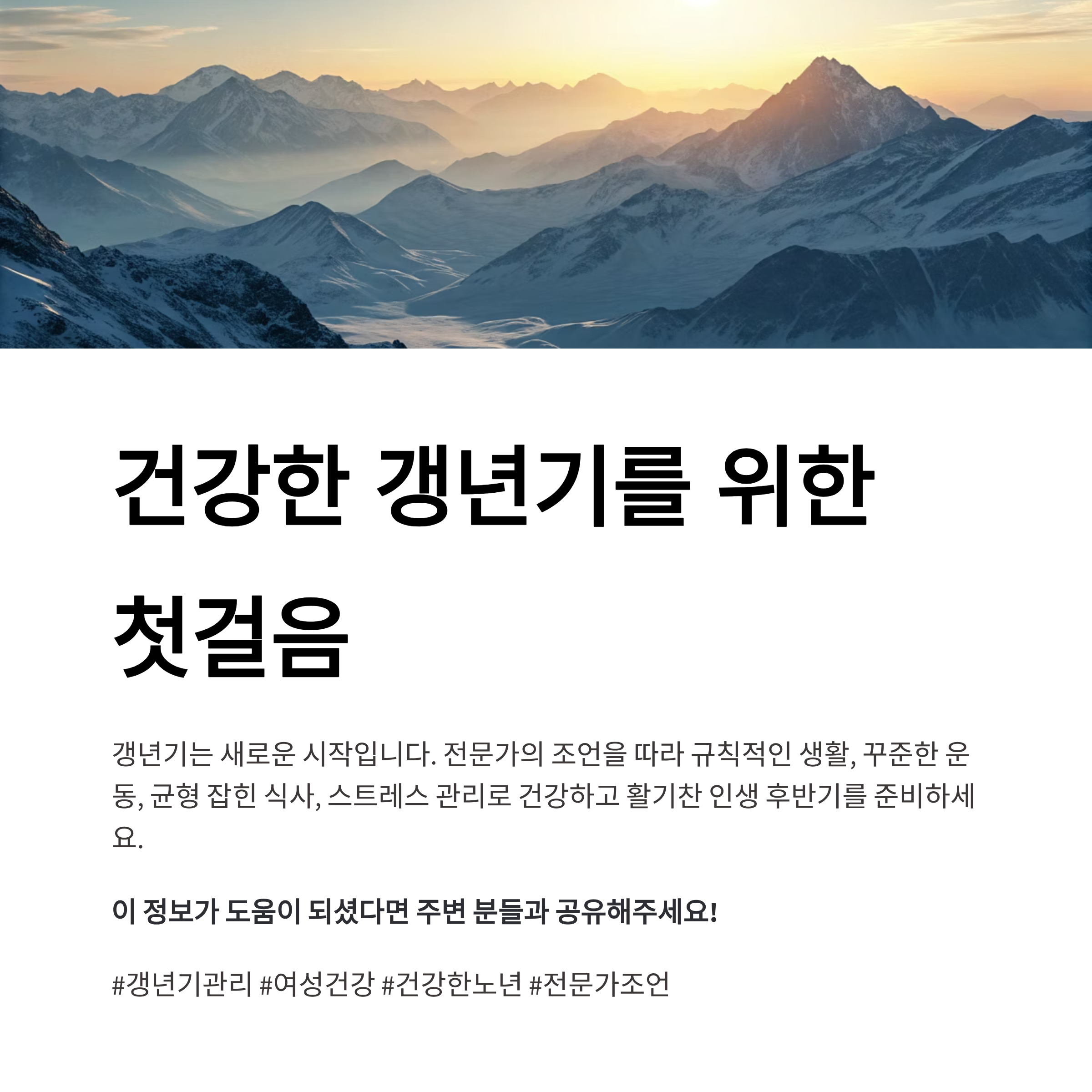 ✅ 요약: 갱년기 건강관리의 핵심은 운동, 식단, 스트레스 관리, 수면, 전문가 상담입니다. 삶의 질을 지키기 위한 포괄적 접근이 필요합니다.