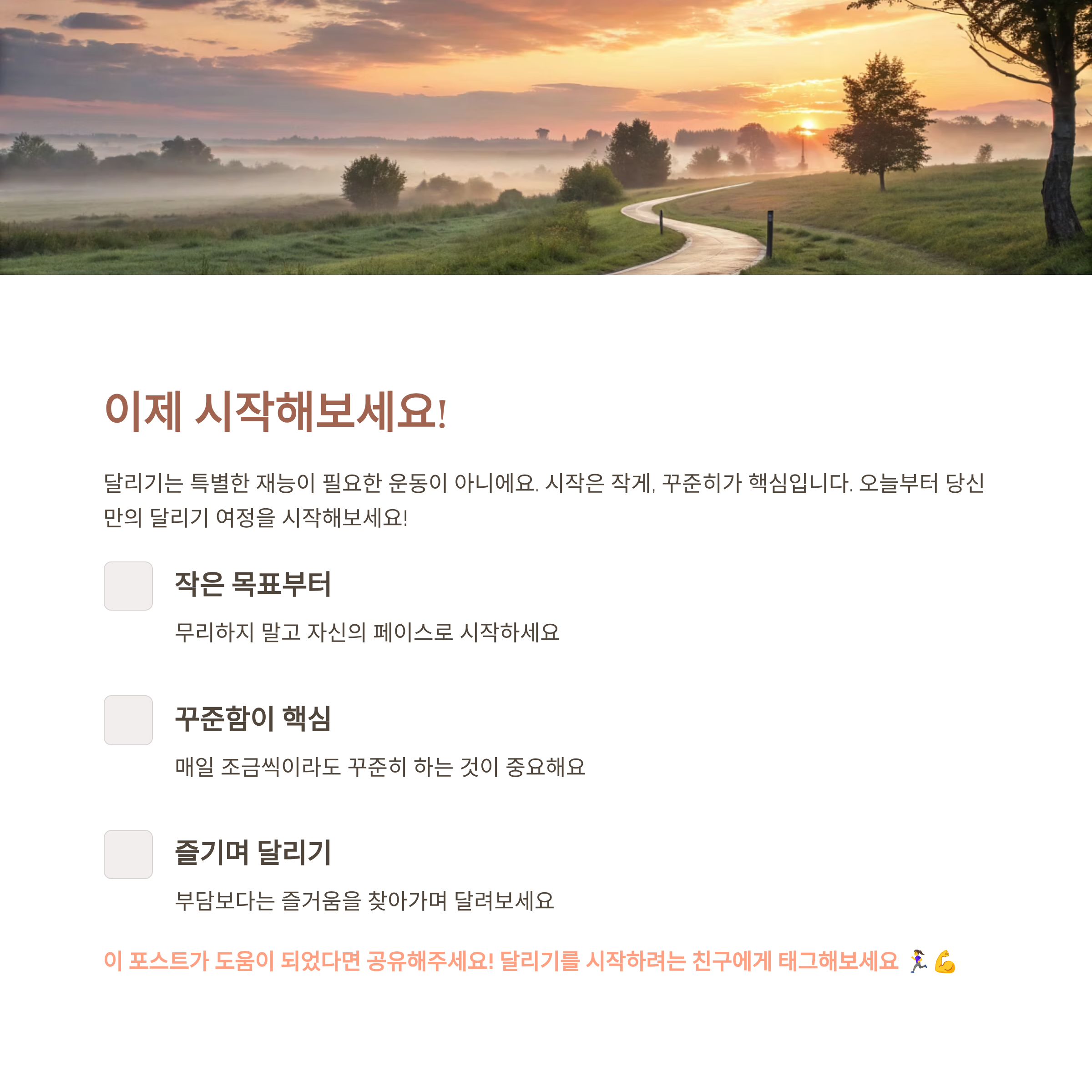 👉 이 글은 달리기를 처음 시작하는 분들을 위한 가이드이며, 의료적 조언이 아닌 일반적인 생활 정보입니다.