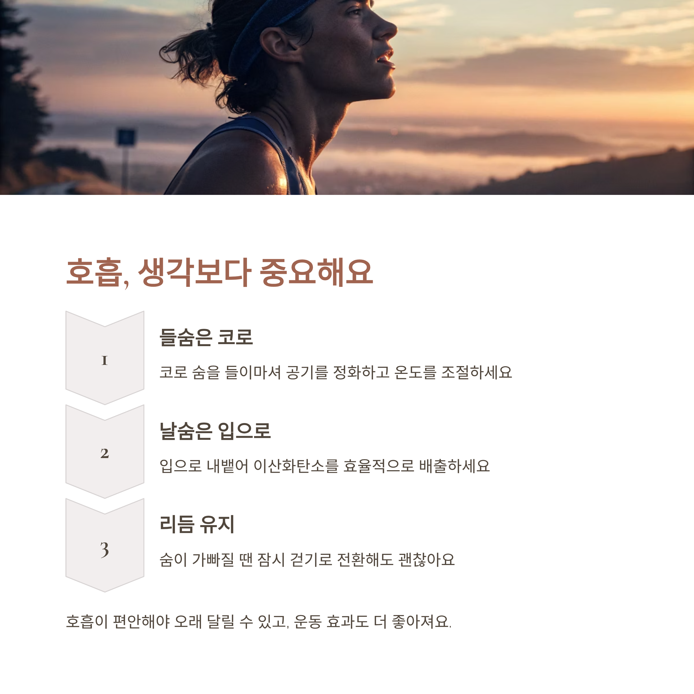 “들숨은 코로, 날숨은 입으로”가 기본이에요. 숨이 가빠지면 걷기로 전환해도 괜찮습니다. 중요한 건 호흡 리듬 유지예요.