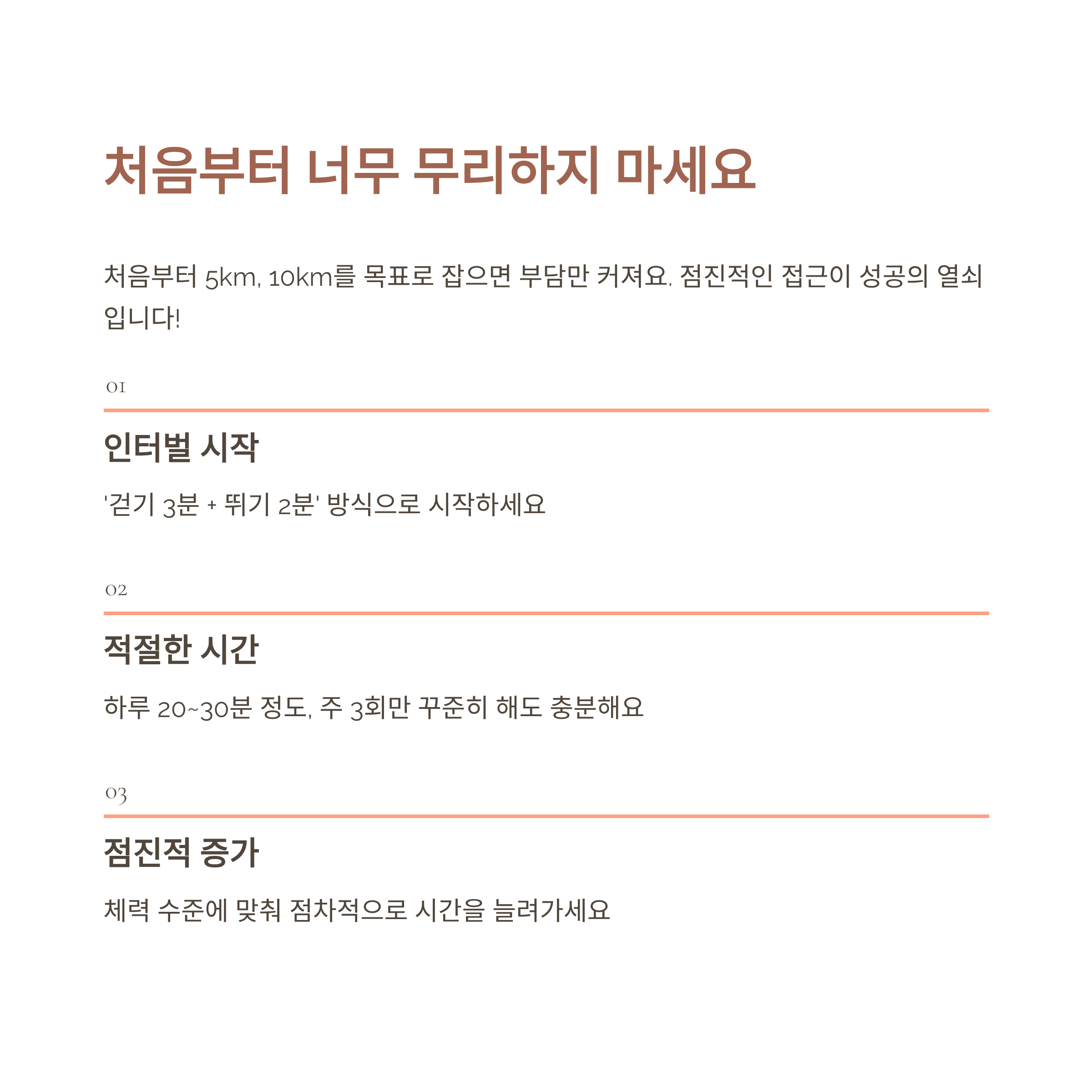 - 처음엔 무리하지 말고 걷기+달리기 병행