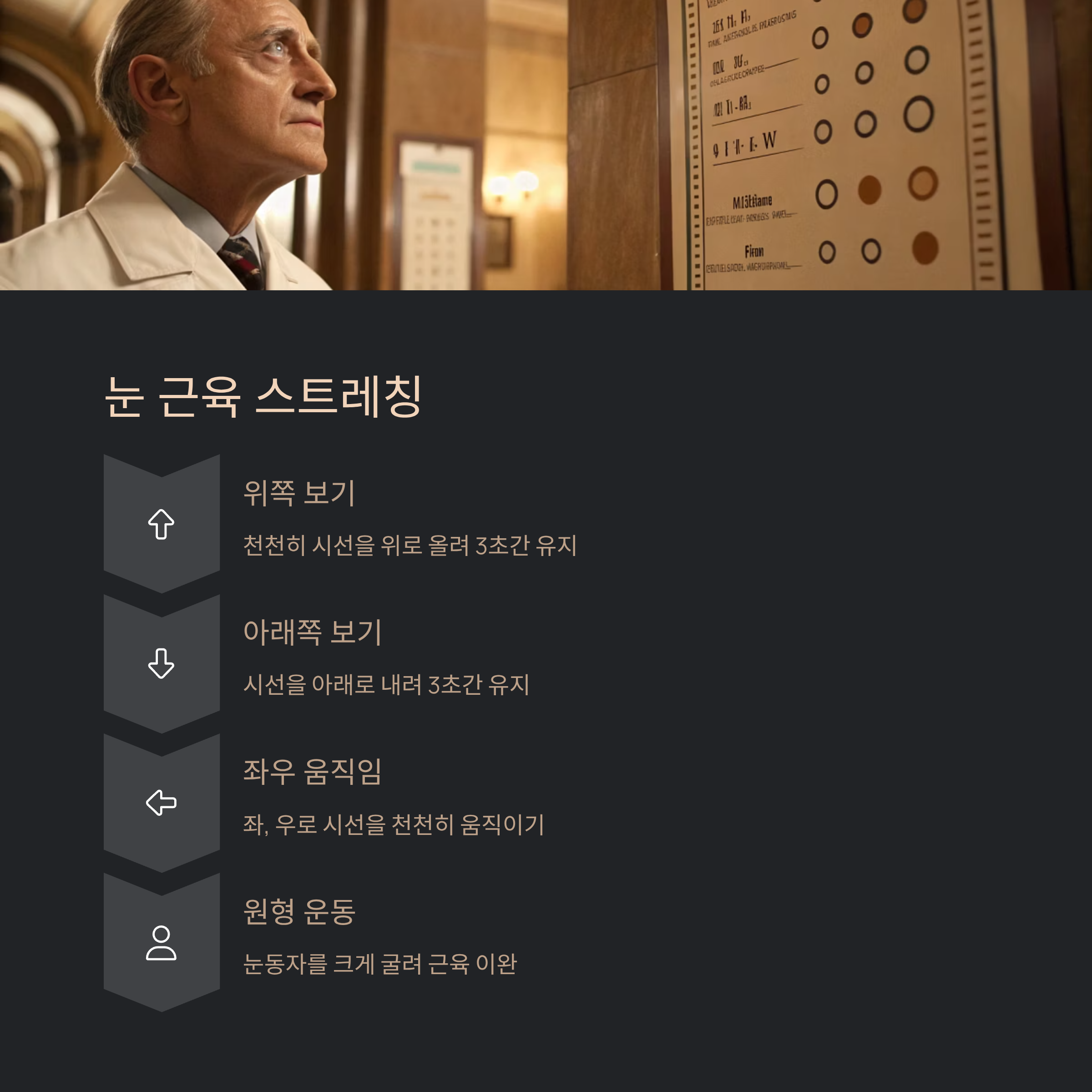 위, 아래, 좌, 우로 시선을 천천히 움직여 눈동자를 굴려주세요. 목 스트레칭을 함께 하면 효과가 더 큽니다.