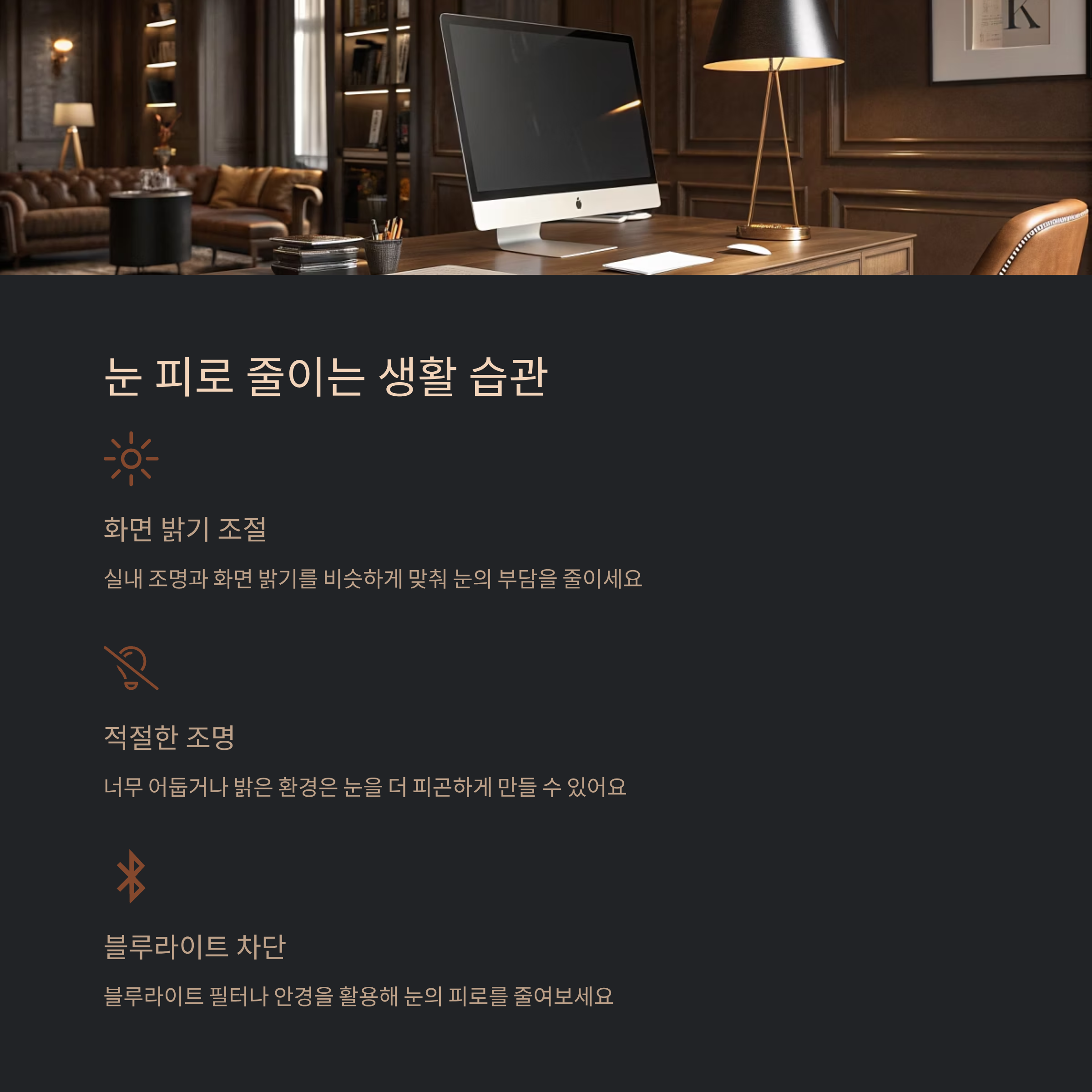모니터는 눈높이보다 살짝 낮게 두고, 화면과의 거리는 팔 길이 정도로 유지하세요. 올바른 자세만으로도 눈의 부담을 줄일 수 있습니다.