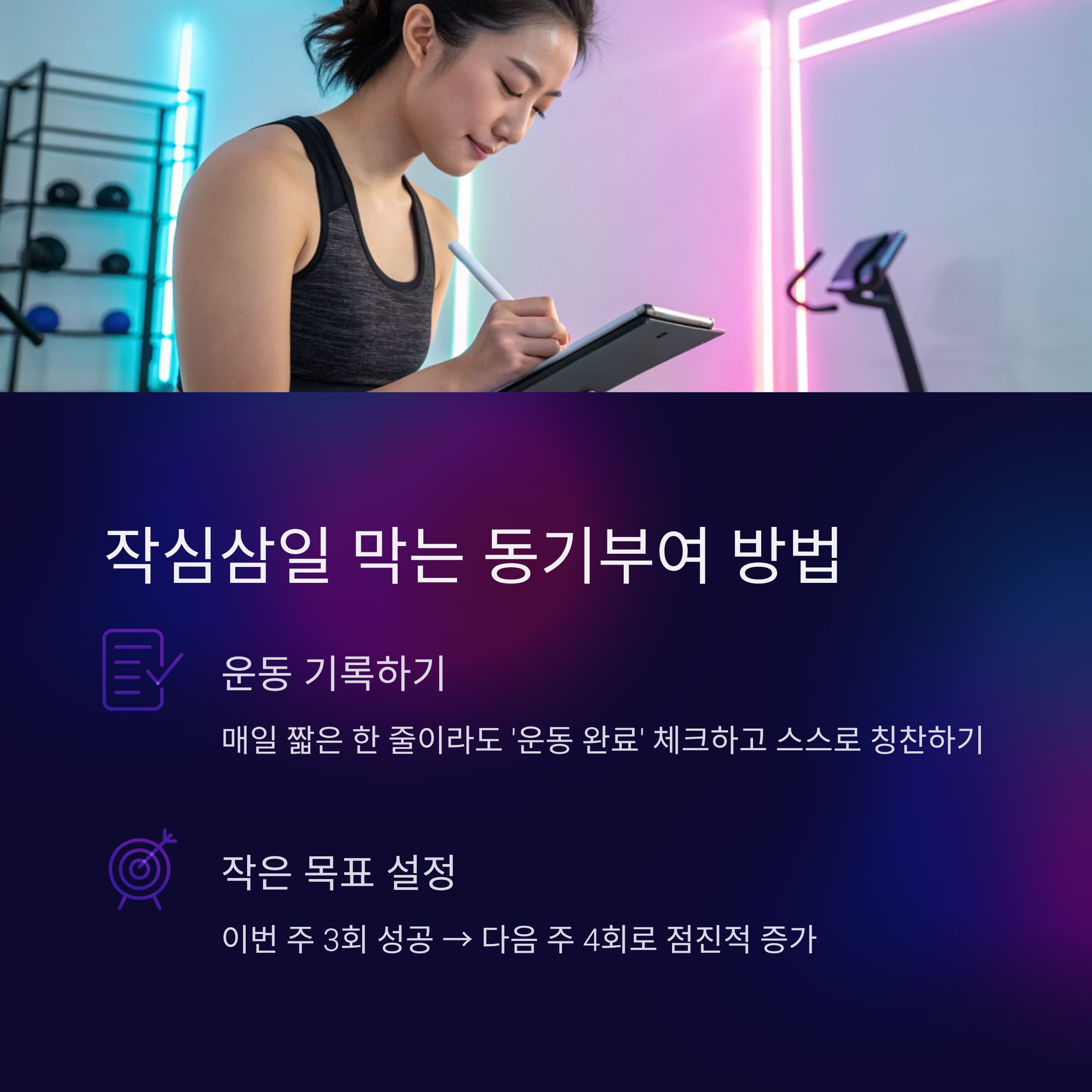매일 짧은 한 줄이라도 '운동 완료'를 체크하고, 스스로를 칭찬해 주세요.