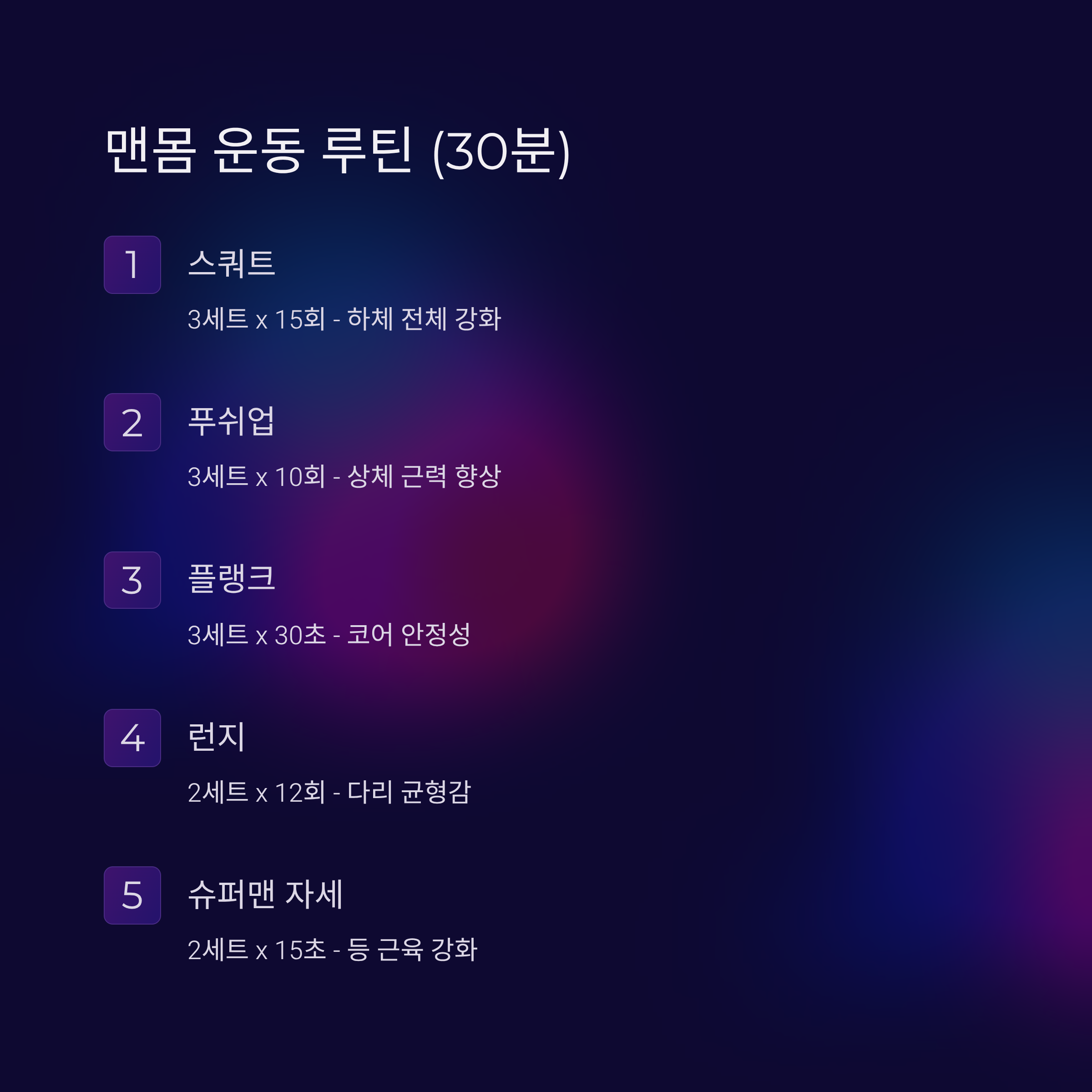 초보자에게 가장 현실적인 방법은 맨몸 운동입니다. 실내에서 가능하고, 어디서든 바로 시작할 수 있어요.