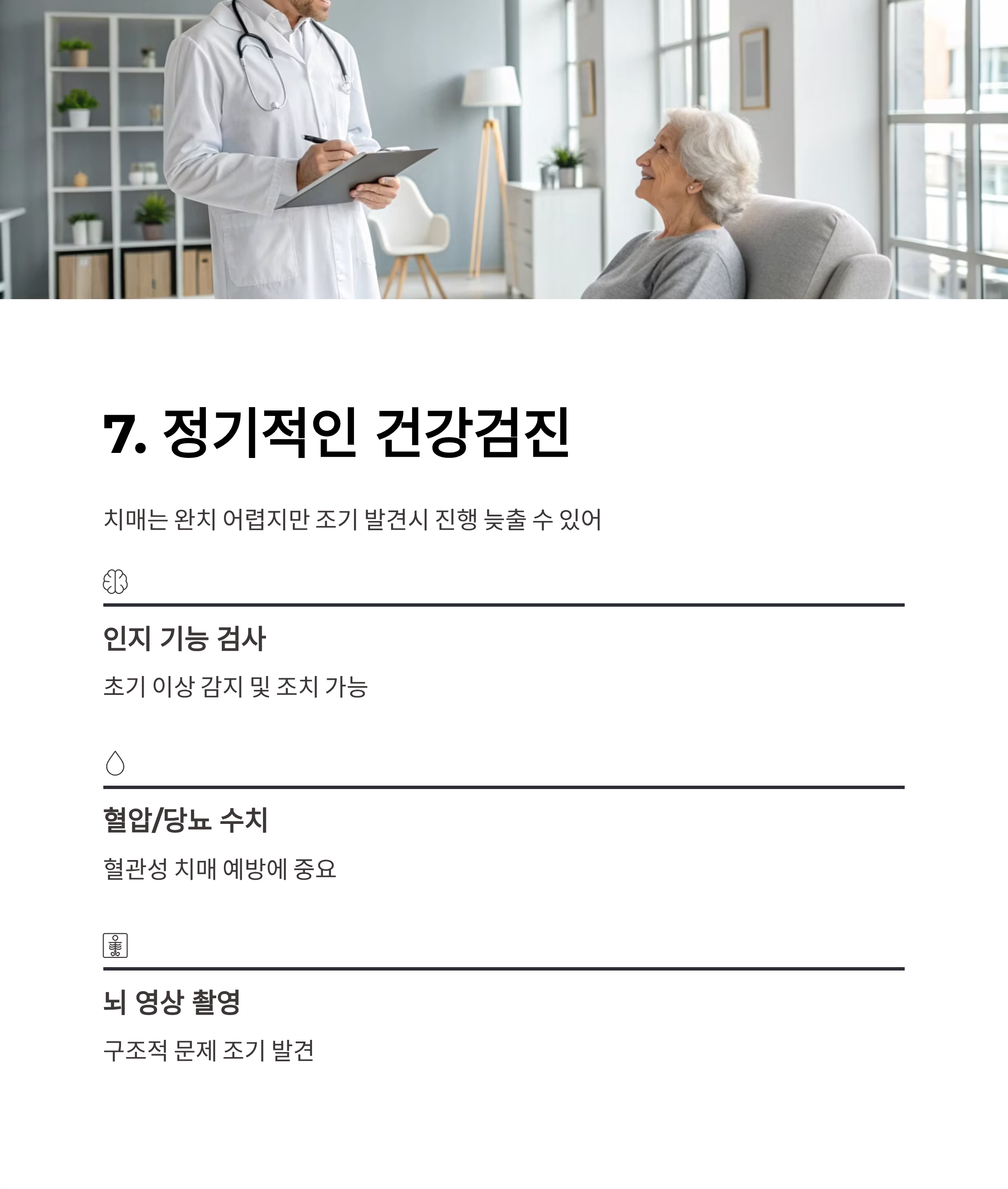정기적인 건강검진과 인지 기능 검사, 혈압·당뇨·콜레스테롤 수치 관리 등