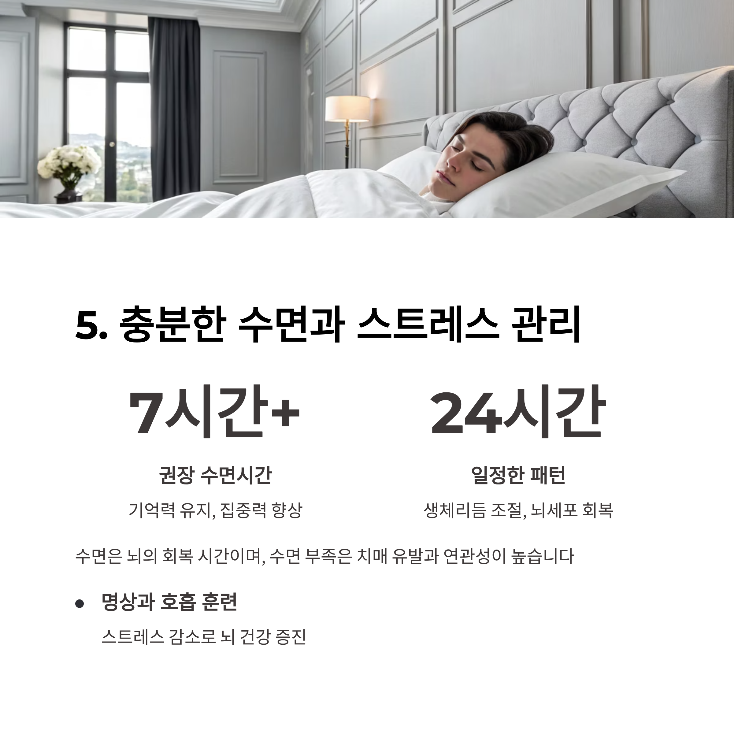 | 7시간 이상 수면 | 기억력 유지, 집중력 향상 |