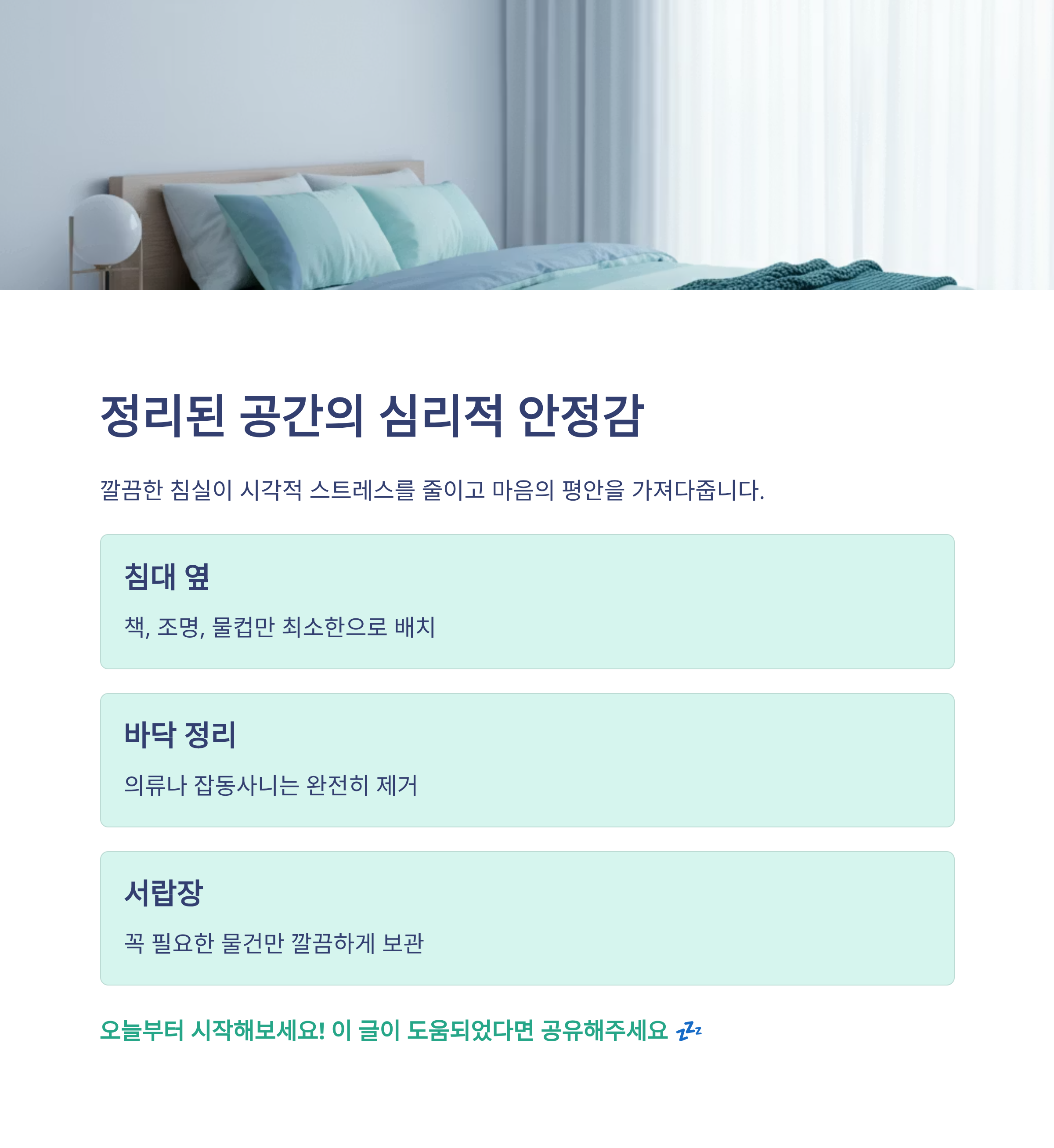 마지막으로, 어질러진 방은 시각적으로도 스트레스를 유발합니다. 침실만큼은 늘 깔끔하게 정리정돈하는 습관을 들여보세요. 불필요한 물건을 줄이고, 침대 주변은 최소한의 물건만 두는 것도 숙면에 도움을 줍니다.