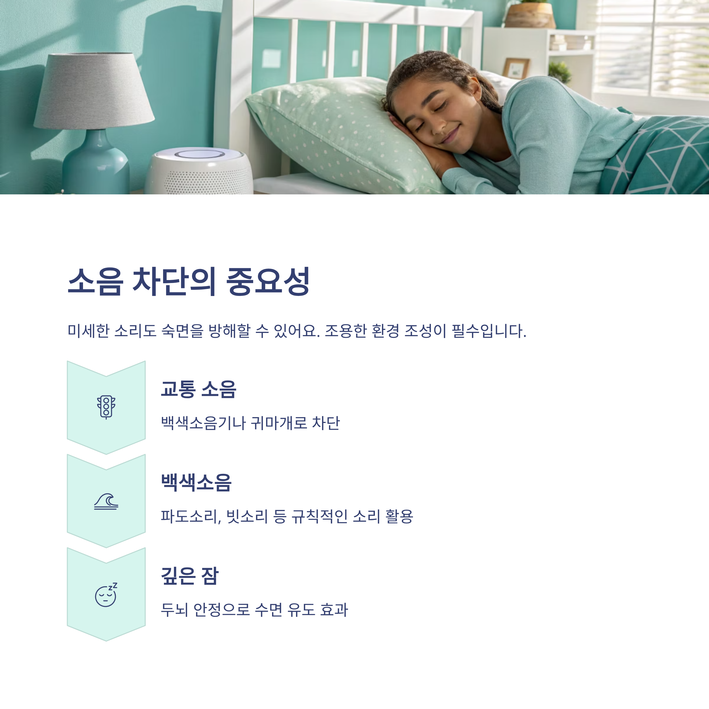특히 규칙적인 소리(예: 파도소리, 빗소리 등)는 두뇌를 안정시켜 수면 유도에 도움이 될 수 있습니다.