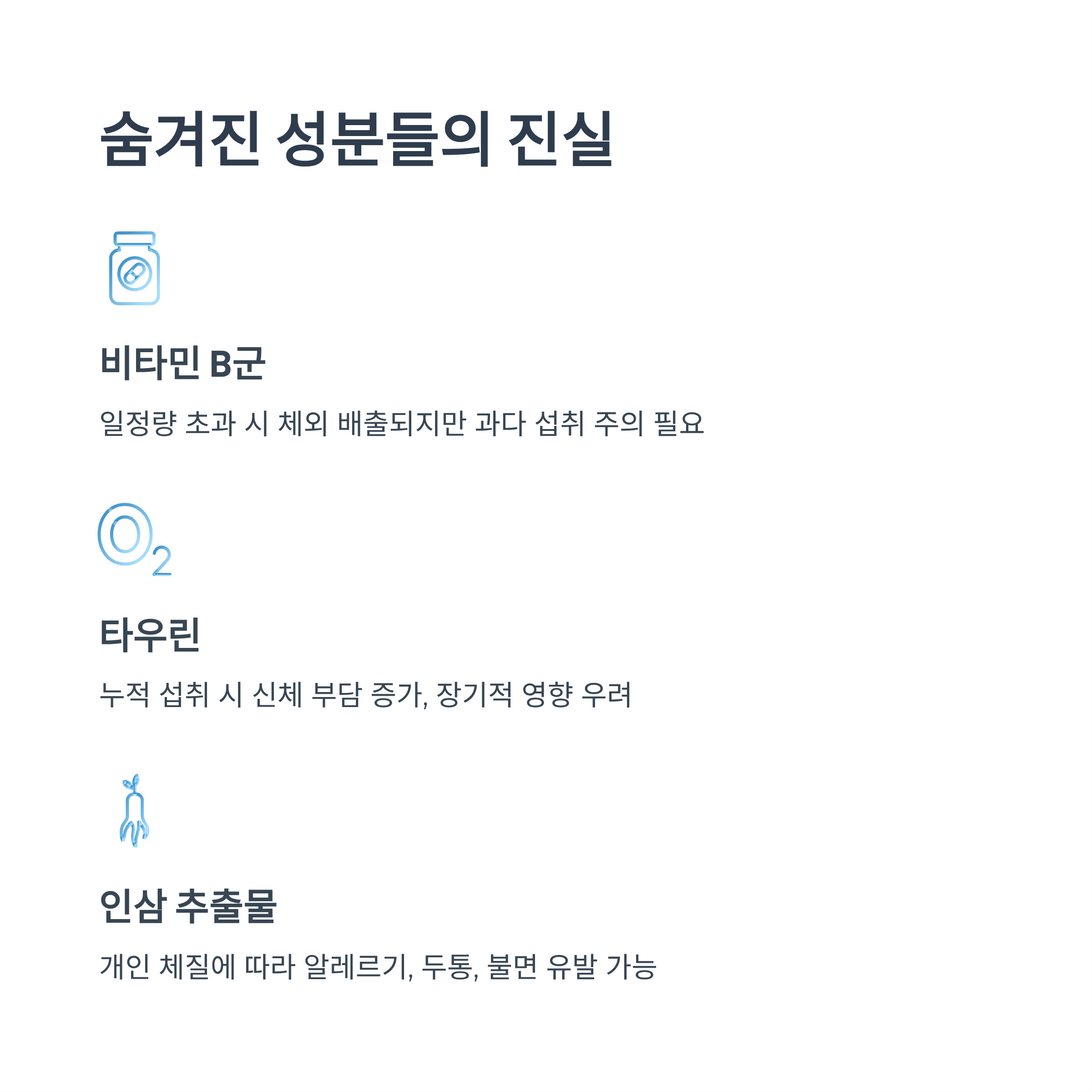 | 타우린 | 간과 신장 부담, 혈압 상승 가능성 |