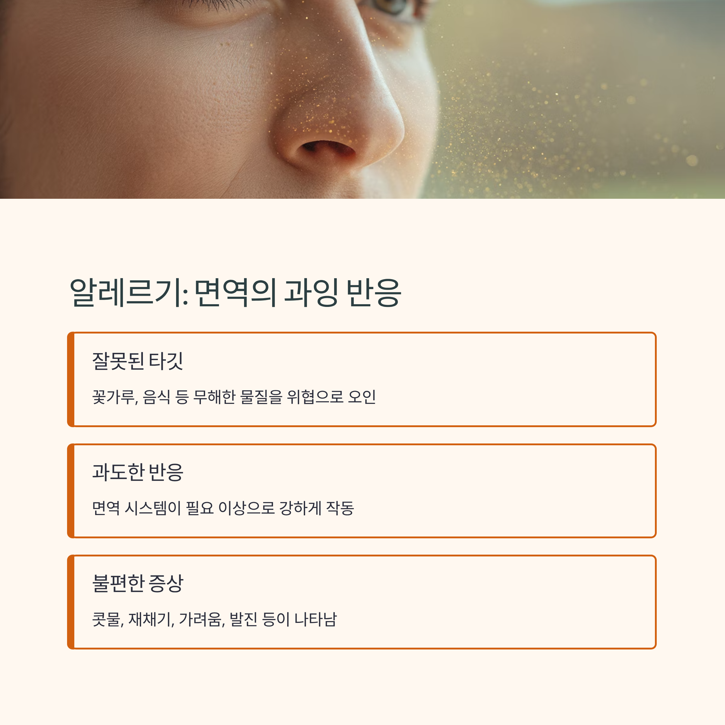 꽃가루나 먼지, 특정 음식처럼 원래는 해롭지 않은 것에 대해 면역 시스템이 위협으로 오인하고 반응하는 거죠.